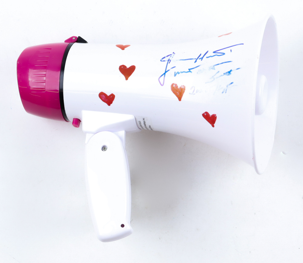 Megaphone has been hand signed by Jimmy Hart (HOF). Please note the signature is smudged and the hearts are fading.