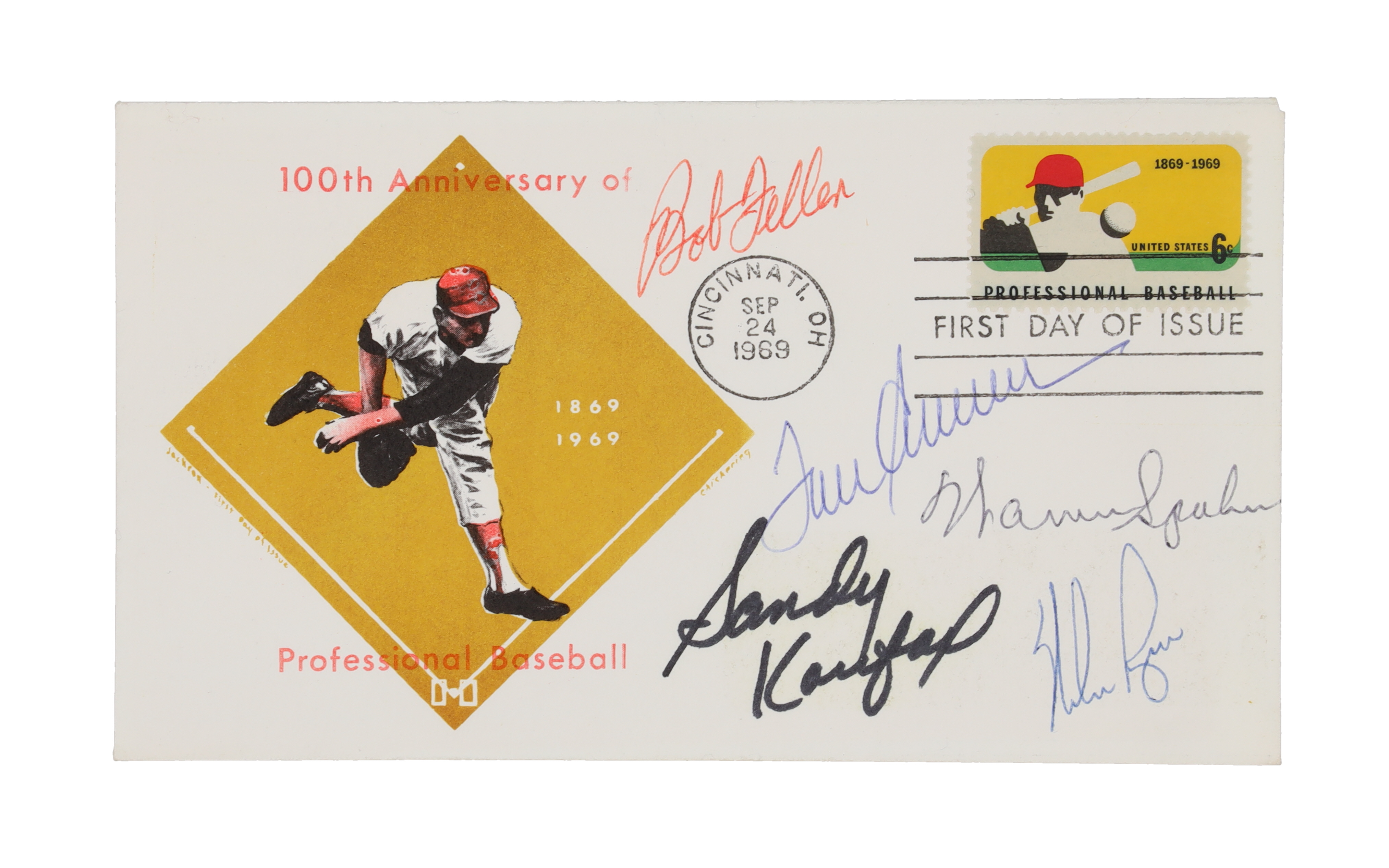 First Day of Issue commemorative envelope post marked September 24th, 1969. Hand-signed by Sandy Koufax (HOF), Bob Feller (HOF), Warren Spahn (HOF), Nolan Ryan (HOF) and Tom Seaver (HOF). Please refer to photos for more details.