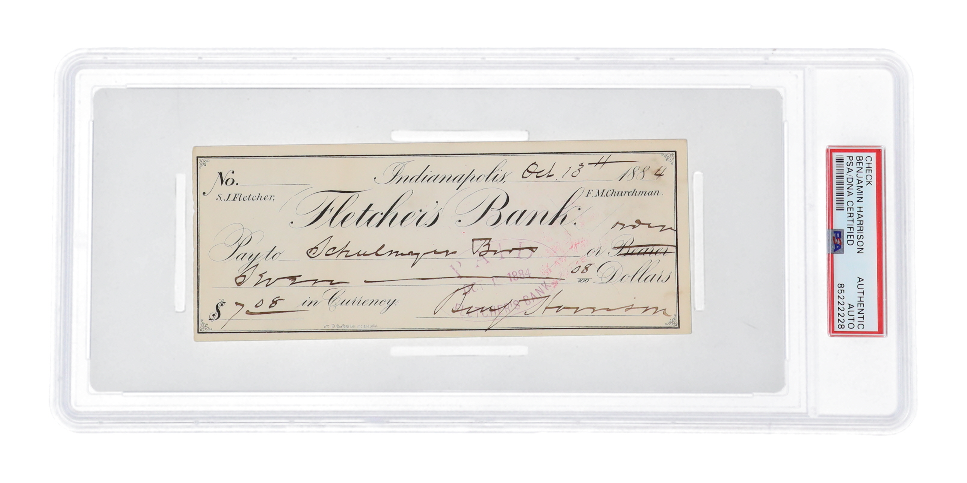 Benjamin Harrison Signed 1884 Bank Check (PSA)