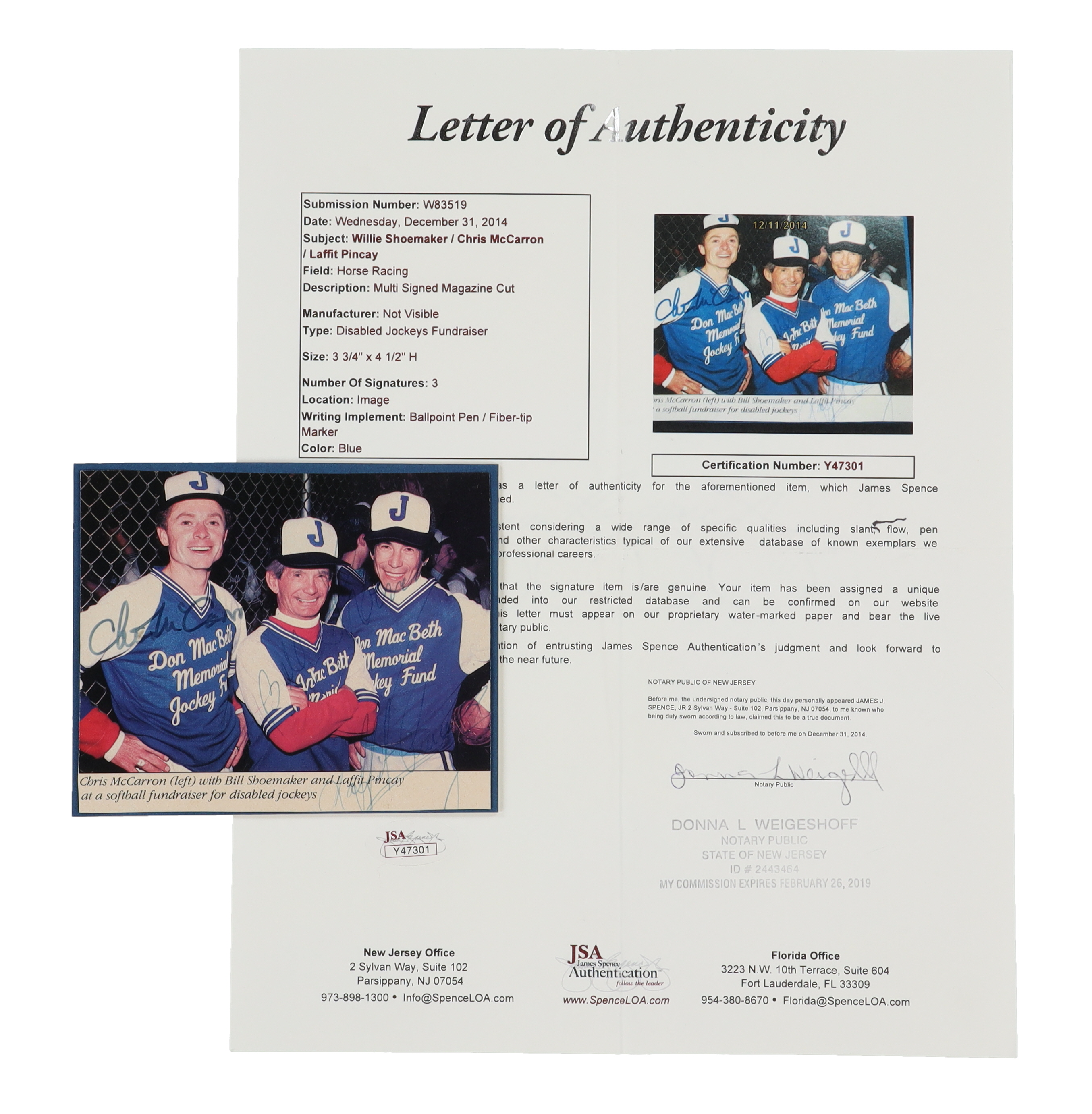 Willie Shoemaker, Chris McCarron & Laffit Pincay Signed Magazine Cut (JSA)