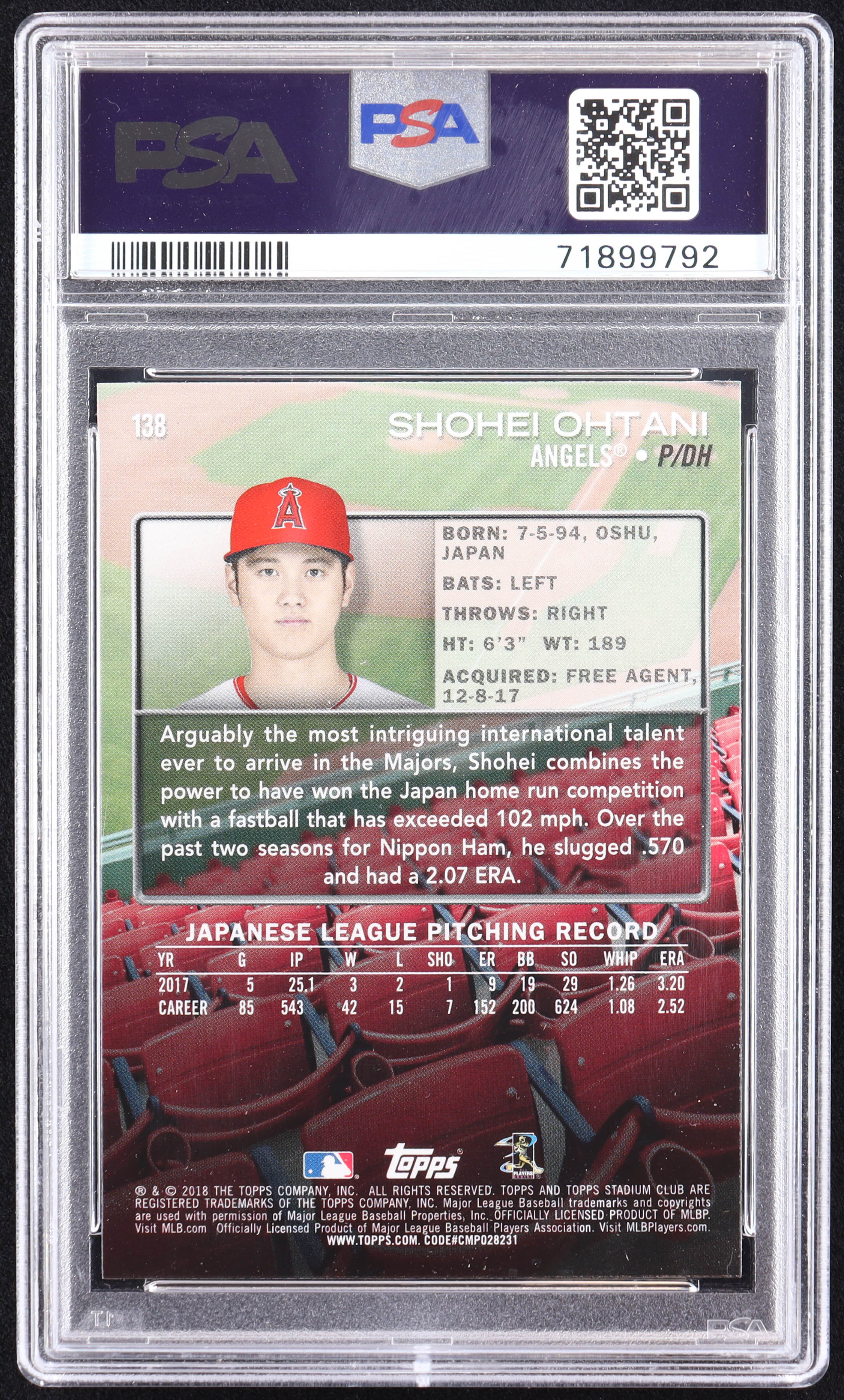 Shohei Ohtani 2018 Stadium Club #138 RC (PSA 8)