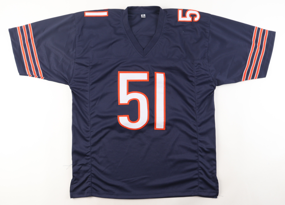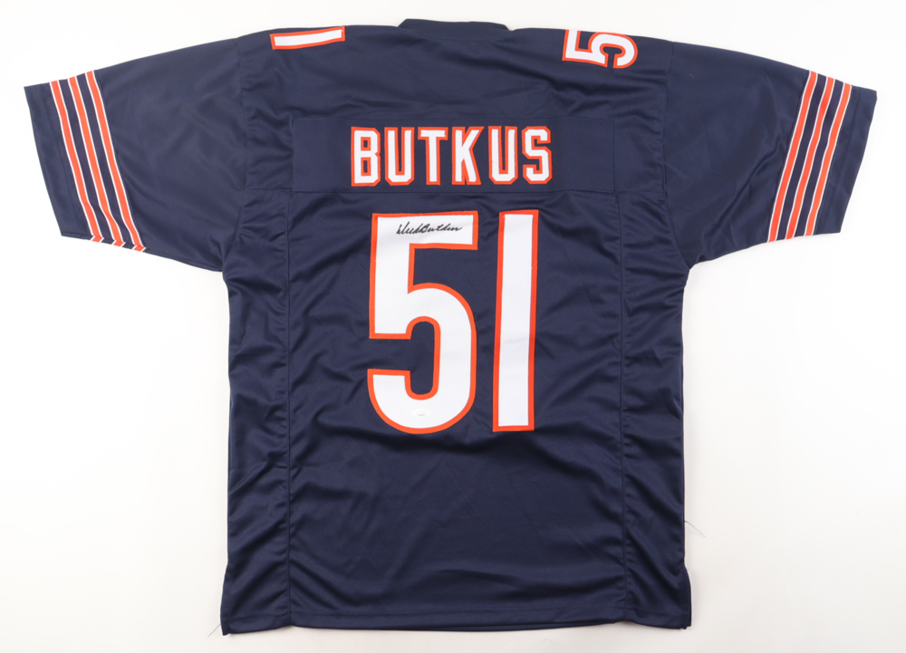 Custom jersey with everything sewn on, size XL. Hand-signed by Dick Butkus (D. 2023, HOF). Please note, the signature has bled.