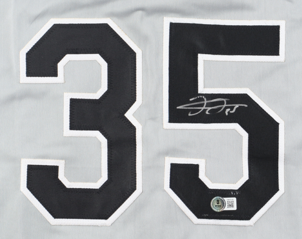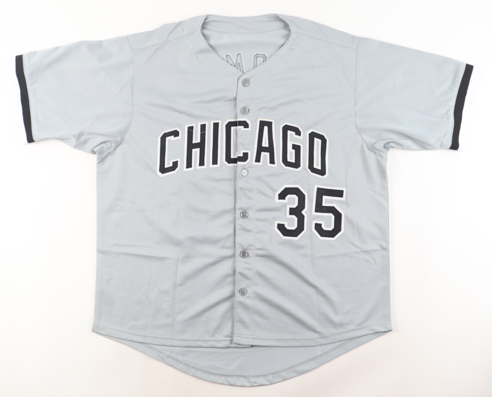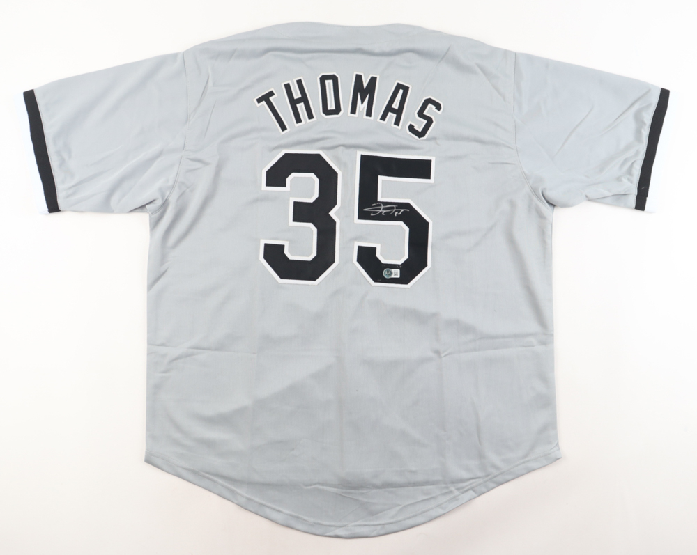 Custom jersey. Everything is sewn on, size XL. Hand-signed by Frank Thomas (HOF). Please note, there is residue on the reverse number and a stain on the back of the jersey.