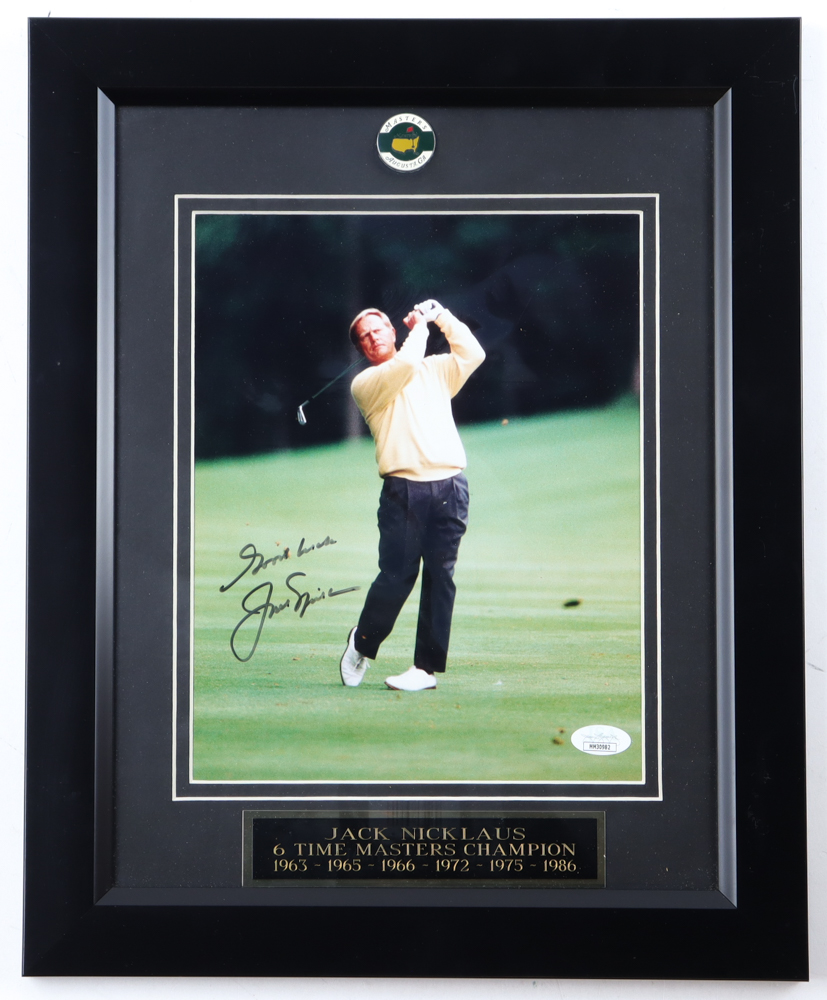 Custom frame measures approximately 13” x 16” in size and features a photo that has been hand-signed and inscribed by Jack Nicklaus (HOF). Please note, there is scuffing on the frame.