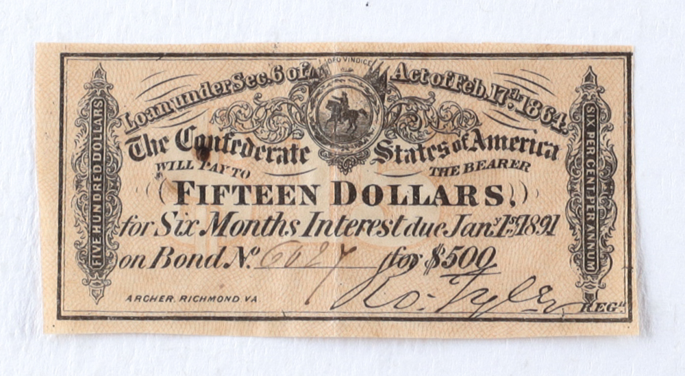 1866 $15 Fifteen Dollars Confederate States of America Richmond CSA Bank Note Bond
