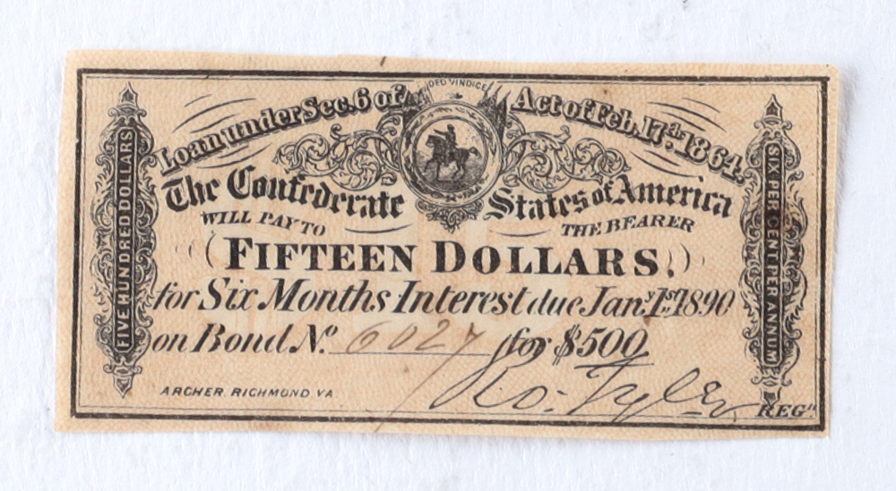 1866 $15 Fifteen Dollars Confederate States of America Richmond CSA Bank Note Bond
