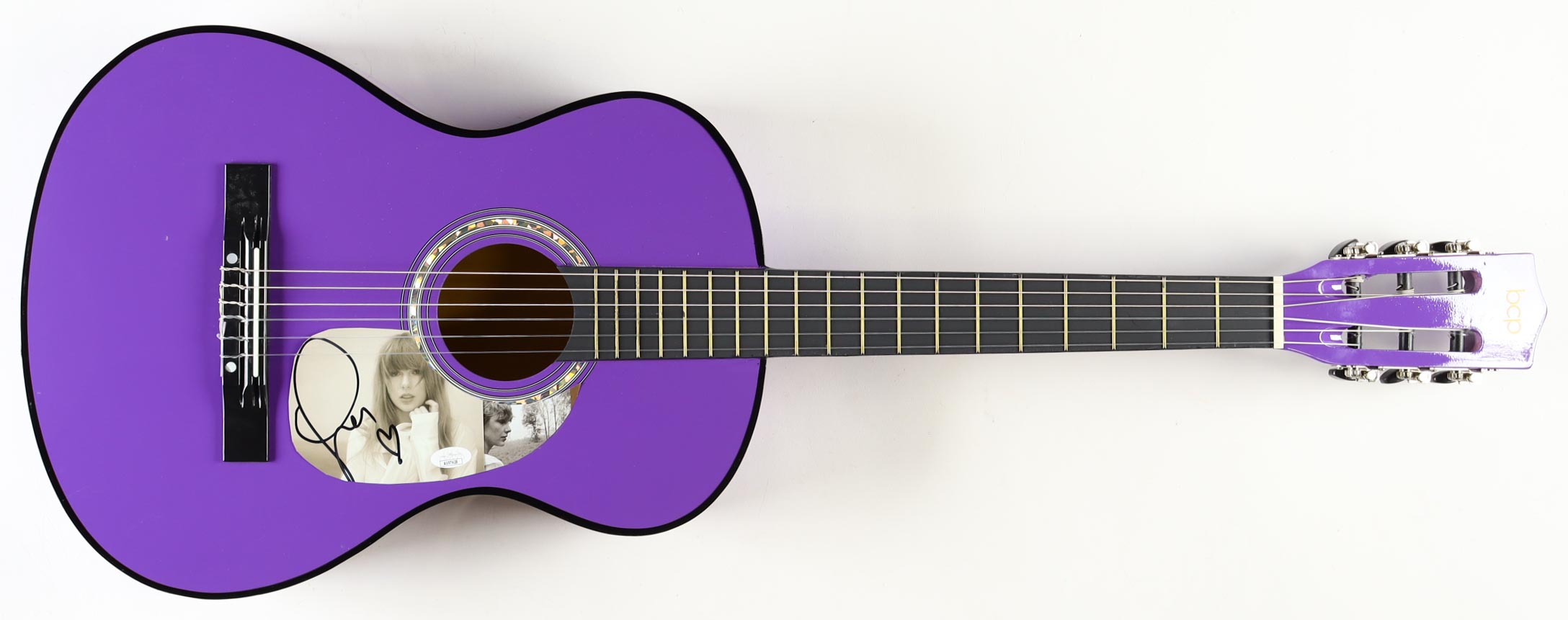 BCP Acoustic guitar measures approximately 38" in length and has been hand-signed on a CD cover that has been repurposed as a pick-guard by Taylor Swift.