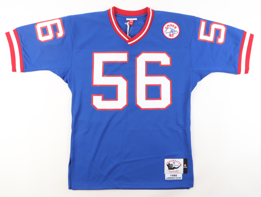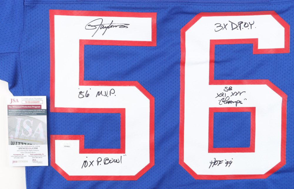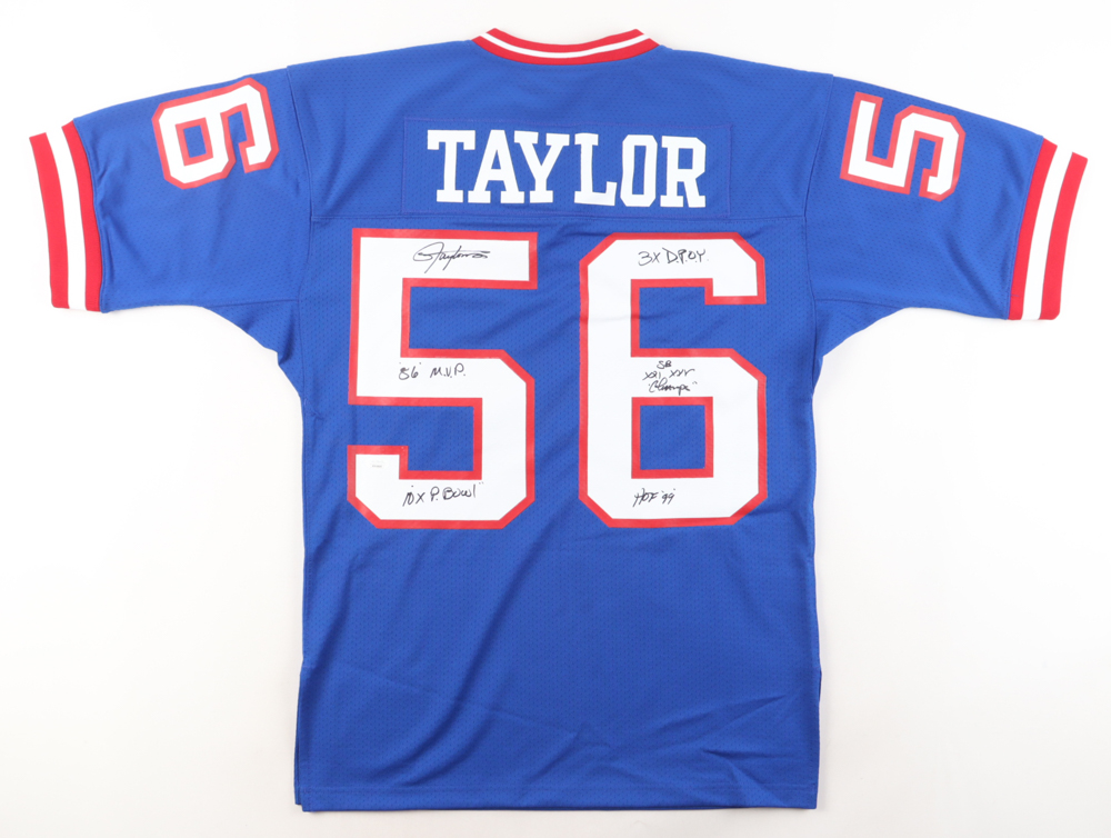 Authentic Mitchell & Ness jersey. Everything is printed on, size 40 (M). Hand-signed and inscribed by Lawrence Taylor (New York Giants, HOF).