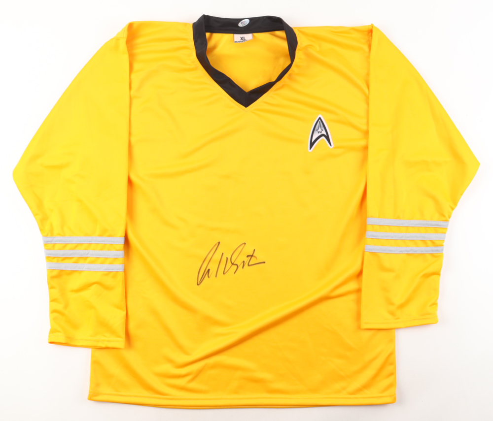 Custom Star Trek uniform. Everything sewn on, size XL. Jersey has been hand-signed by William Shatner (Captain James T. Kirk).