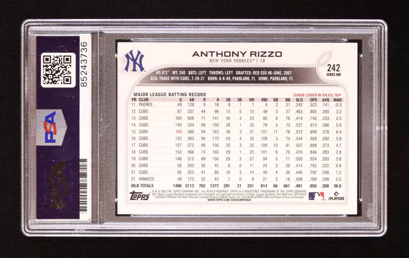 Anthony Rizzo Signed 2022 Topps #242 (PSA)