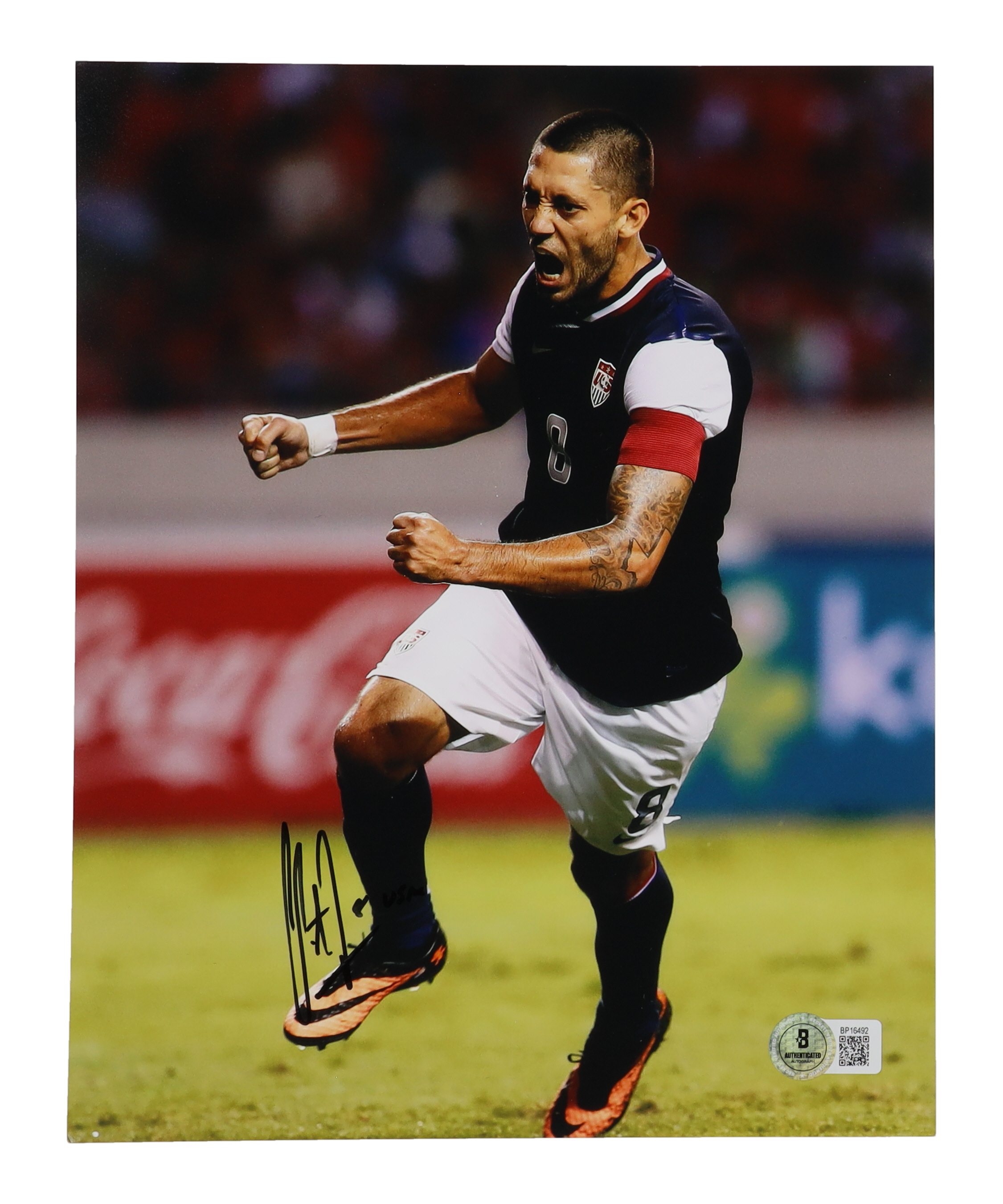 Photo measures 8" x 10" in size and has been hand-signed and inscribed by Clint Dempsey.