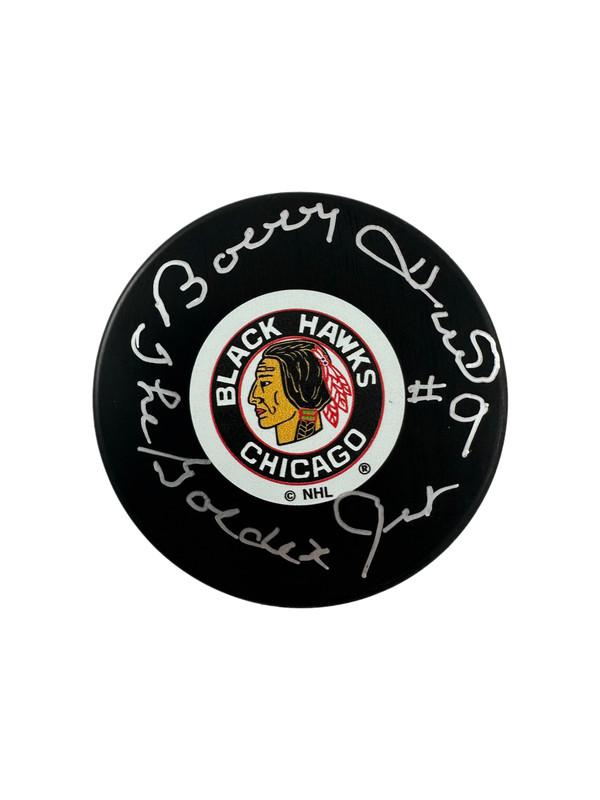 Chicago Blackhawks logo hockey puck has been hand-signed and inscribed by Bobby Hull (D. 2023, HOF).