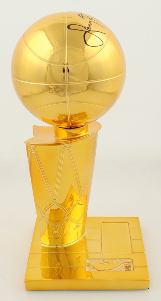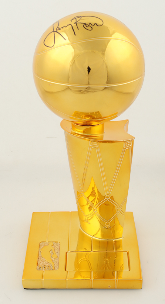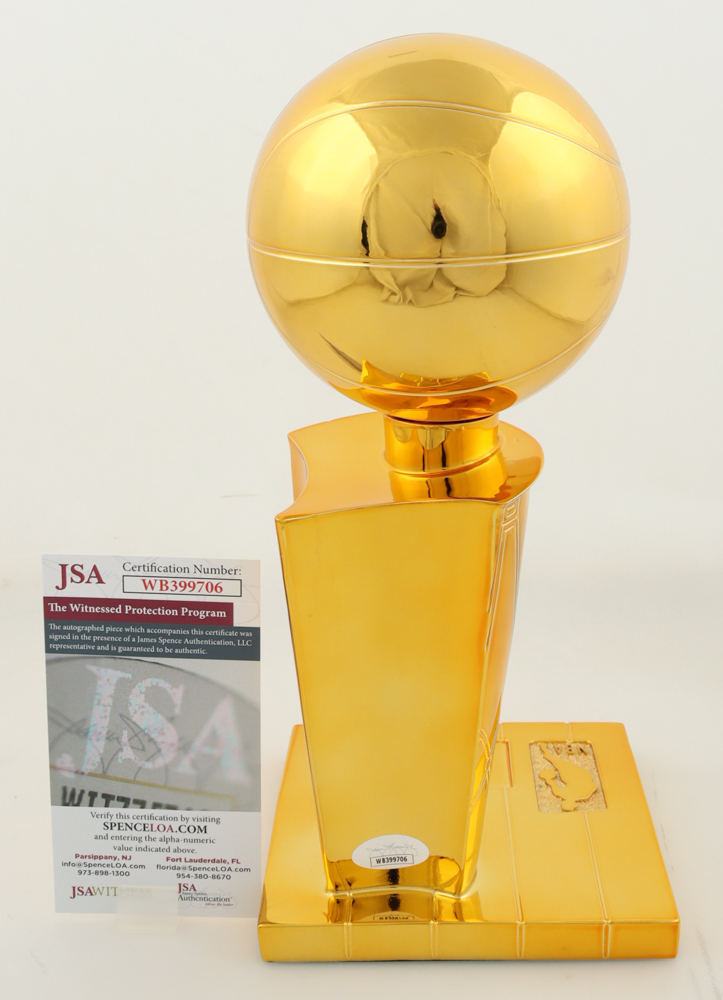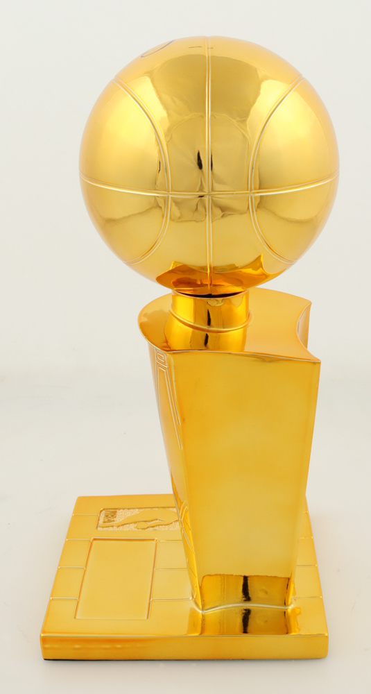 Replica championship trophy measures approximately 12" in height and has been hand-signed Larry Bird (HOF). Please note signature is a bit scuffed.