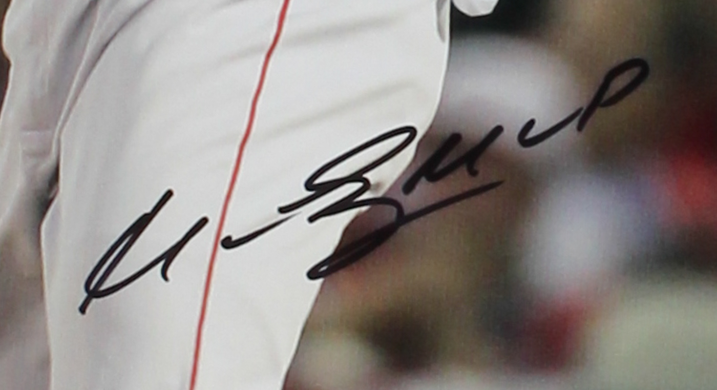 Photo measures 16" x 20" in size and has been hand-signed by Manny Ramirez (Boston Red Sox).