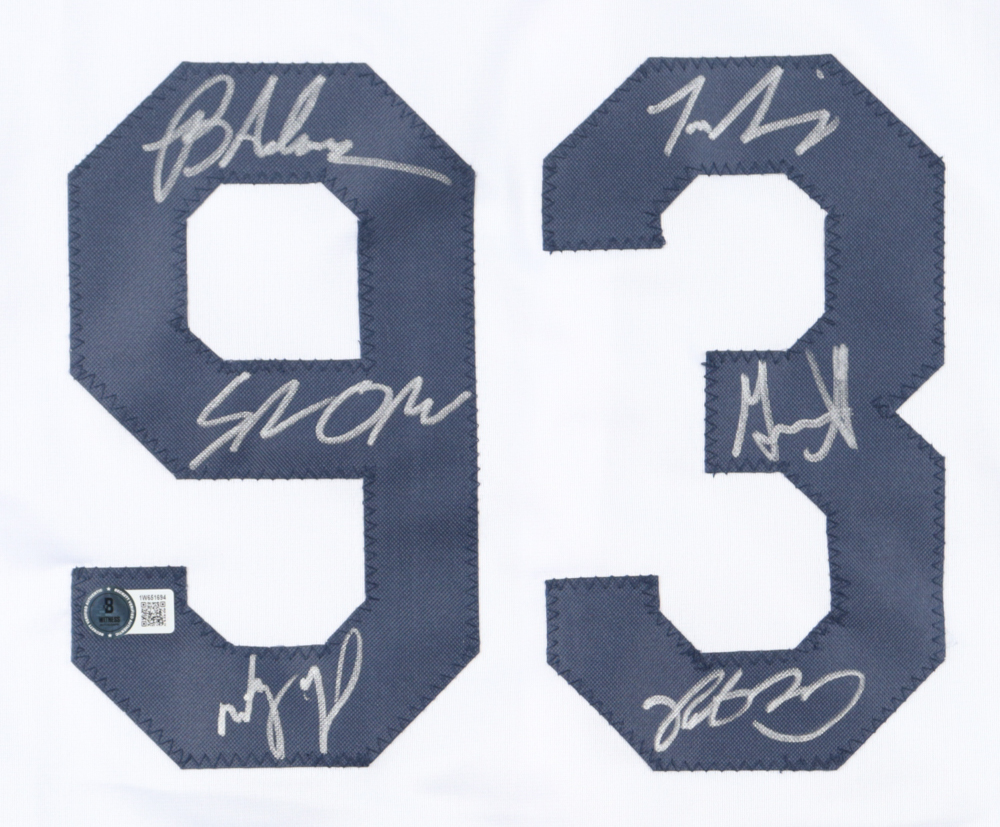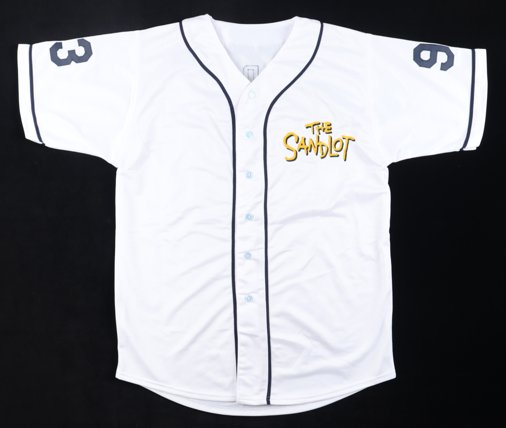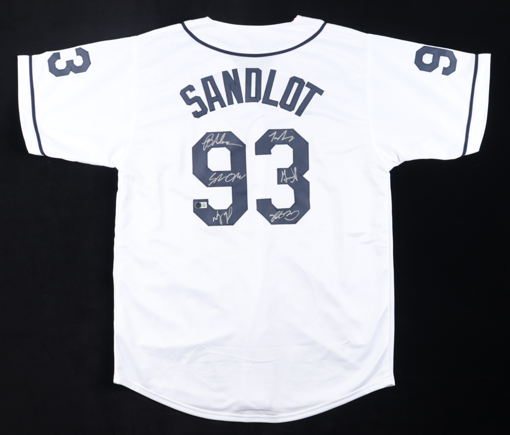 Custom jersey with everything sewn on, size XL. Hand-signed and inscribed by (7) including Tom Guiry (Scotty Smalls), Victor DiMattia (Timmy Timmons), Marty York (Alan "Yeah-Yeah" McClennan), Shane Obedzinski (Tommy 'Repeat' Timmons), Grant Gelt (Bertram Grover Weeks), and Brandon Adams (Kenny DeNunez).