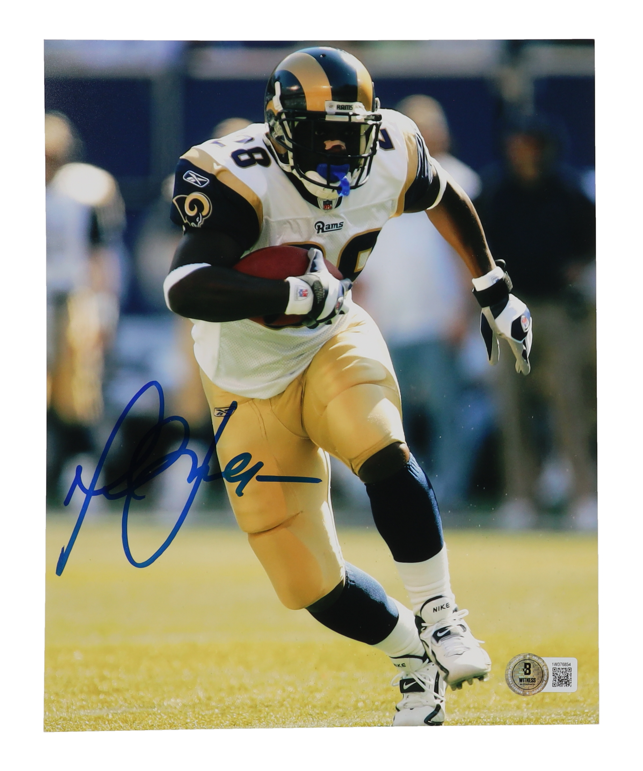 Photo measures 8" x 10" in size. Hand-signed by Marshall Faulk (St. Louis Rams, HOF).