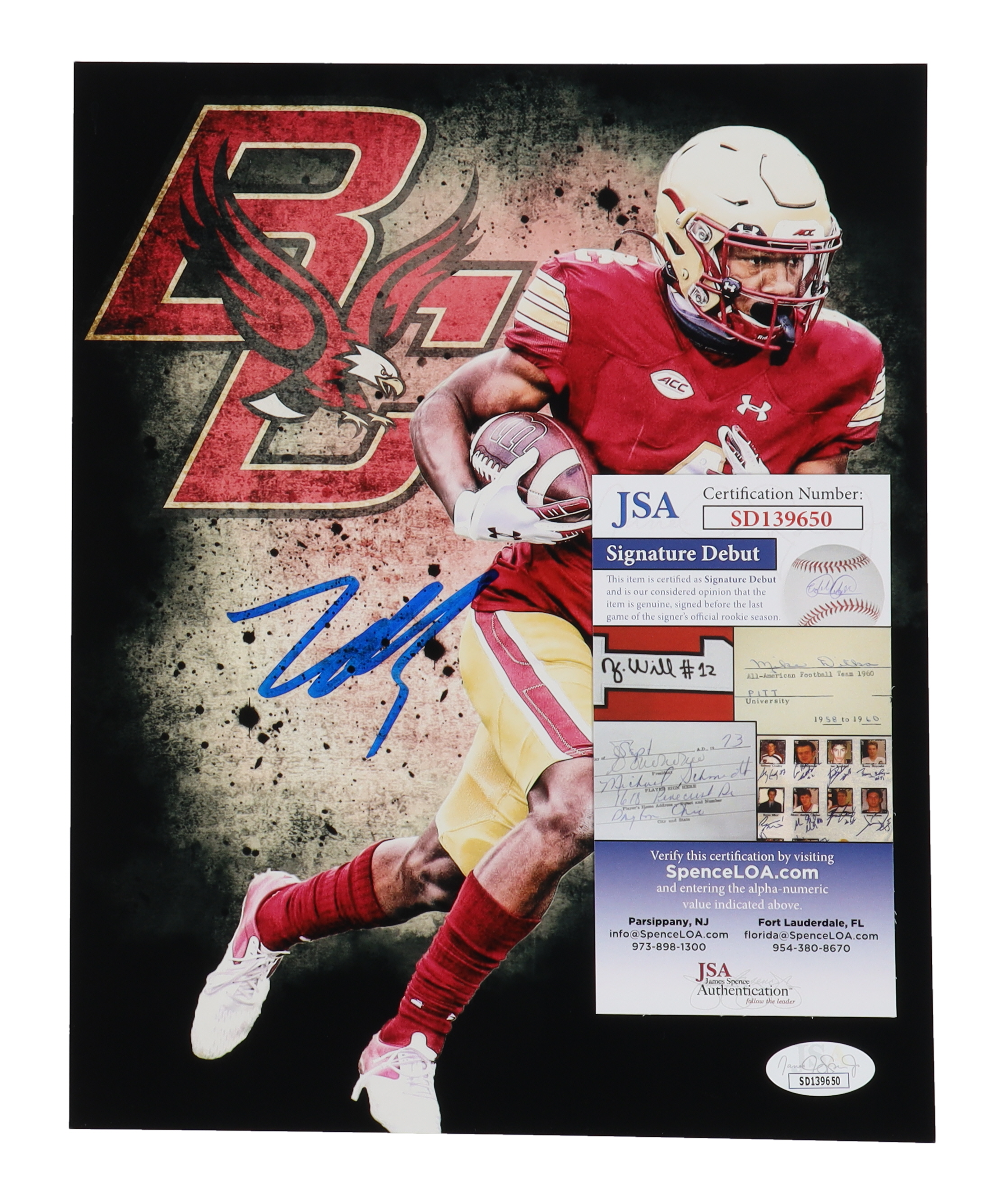 The autograph(s) includes an official James Spence Authentication (JSA) "Signature Debut" hologram and COA. "Signature Debut" is the autographed memorabilia equivalent to a rookie card. The JSA definition of a "Signature Debut" is as follows: "Any item that is autographed and received by JSA prior to the last game of the signer's official rookie season.