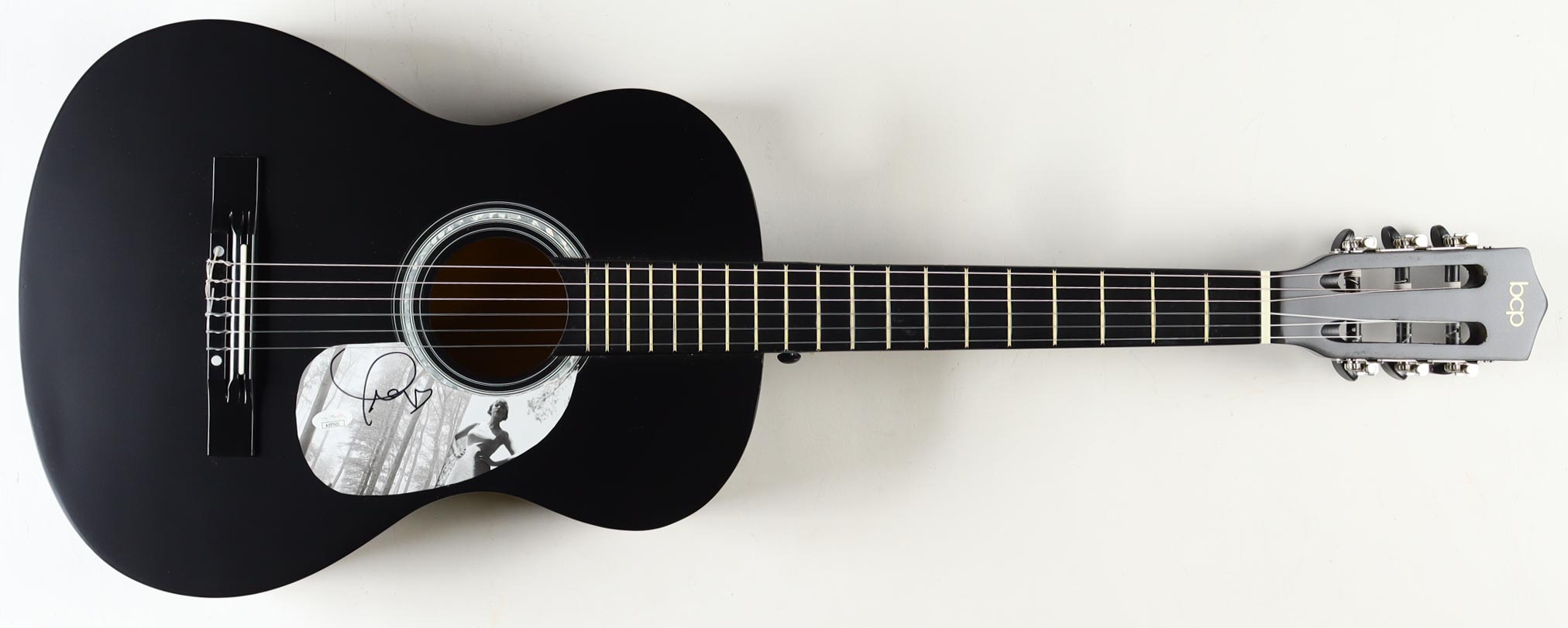 BCP Acoustic guitar measures approximately 38" in length and has been hand-signed on a CD cover that has been repurposed as a pick-guard by Taylor Swift.
