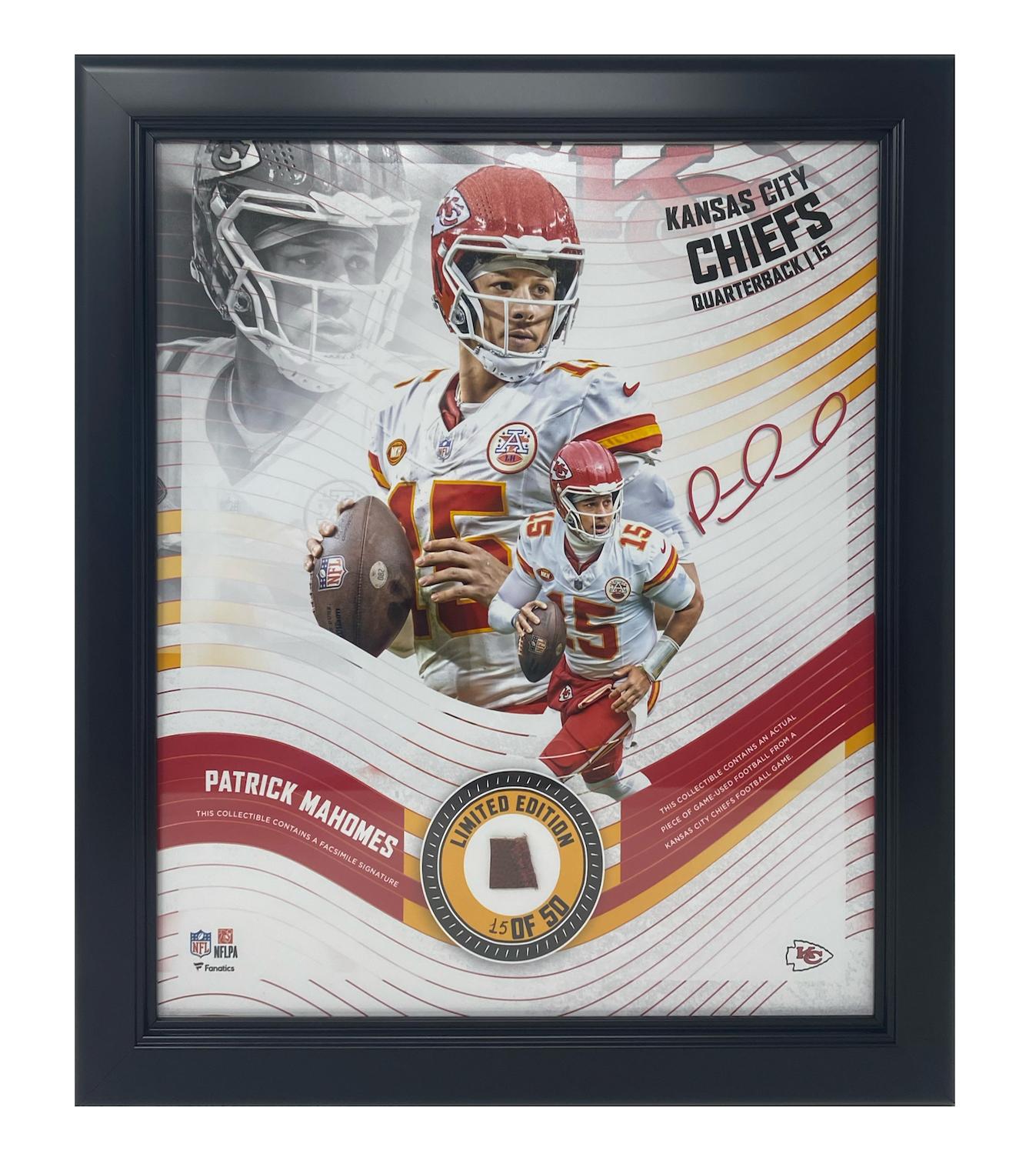 Custom frame measures 15" x 17" in size and features a piece of a football used in-game by the Kansas City Chiefs, affixed to a photo of Patrick Mahomes. This piece is limited to 50 and you will receive number "15" from the edition. Please note that the signature is a facsimile signature.