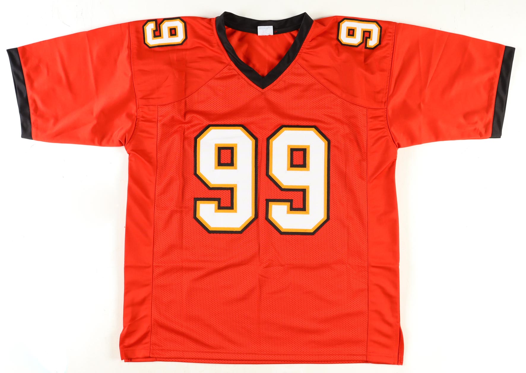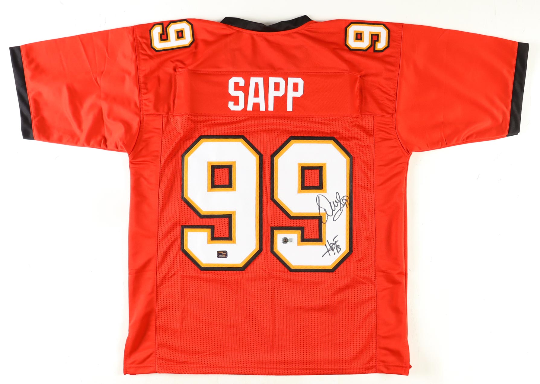 Custom jersey with everything sewn on, size XL. Hand-signed and inscribed by Warren Sapp (HOF).