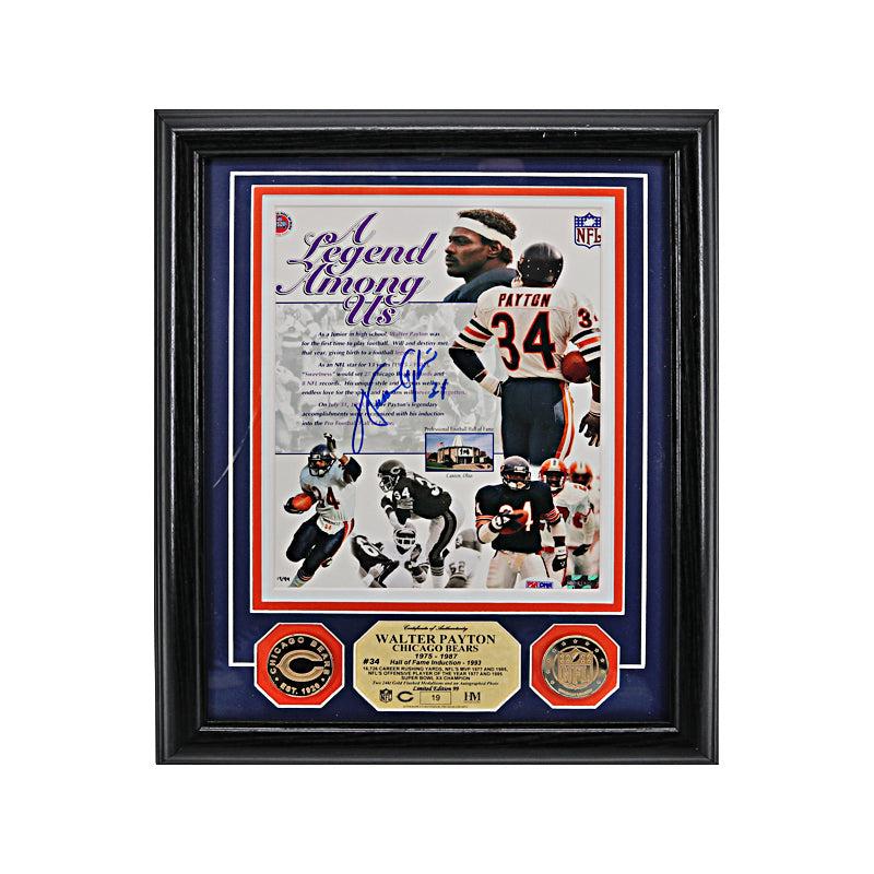 Custom frame measures 13” x 16” in size and features a photo that has been hand-signed by Walter Payton (D. 1999, Chicago Bears, HOF).