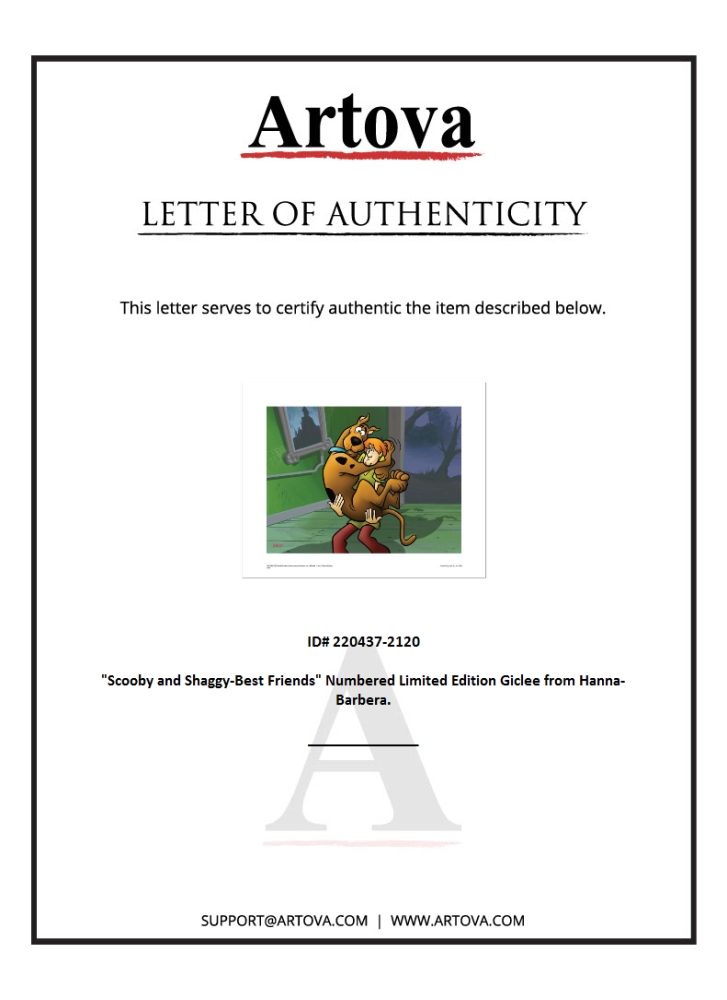 "Scooby and Shaggy-Best Friends" is a limited edition giclee on paper from Hanna-Barbera featuring iconic Scooby-Doo characters. It comes numbered, with a hologram seal, and a Certificate of Authenticity! Measures approx. 20 x 16" (with border), 16" x 12" (image).