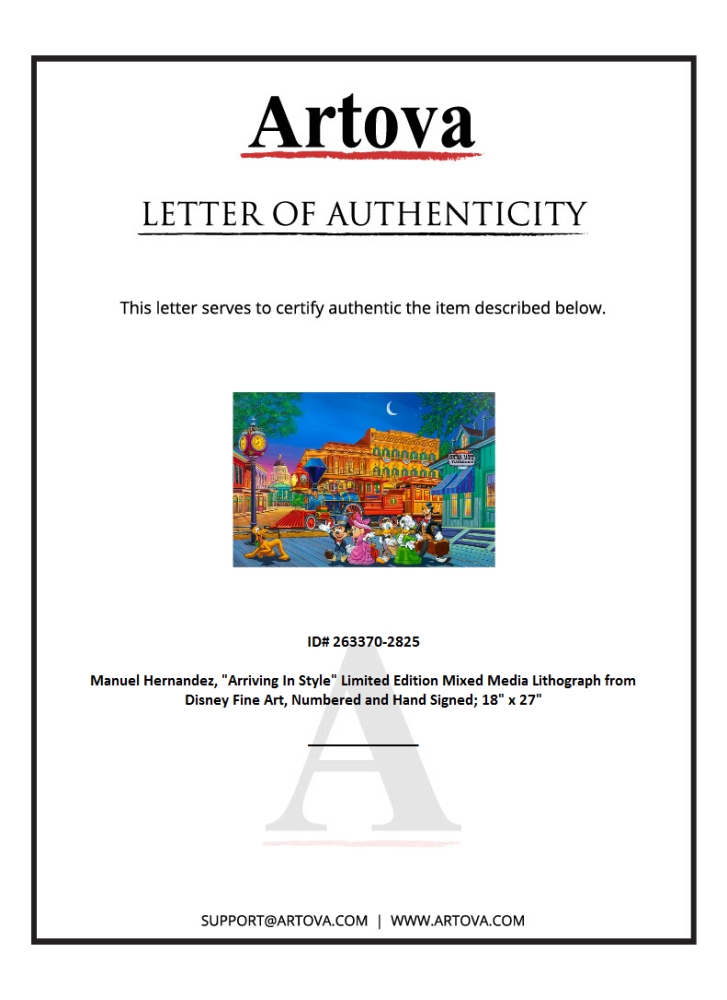 "Arriving In Style" is a limited edition lithograph with serigraph highlights on paper by Manuel Hernandez, numbered and hand signed by the artist. This piece is licensed by Disney Fine Art. Includes Letter of Authenticity. Measures approx. 29" x 20" (border), 27" x 18" (image).