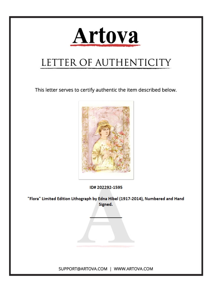 "Flora" is a limited edition lithograph on paper, numbered and hand-signed by Edna Hibel (1917-2014). Includes Certificate of Authenticity! Measures approx. 25" x 35.5" (with border), 22" x 30" (image).