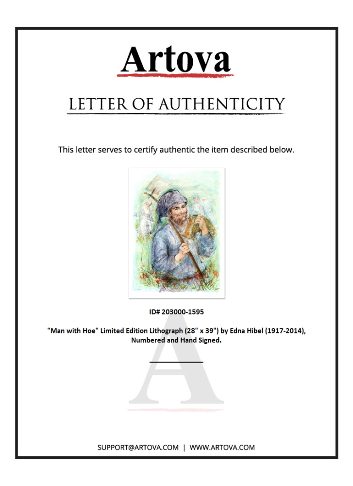 "Man with Hoe" is a limited edition lithograph on paper, numbered and hand-signed by Edna Hibel (1917-2014). Includes Certificate of Authenticity! Measures approx. 30" x 41.5" (with border), 28" x 39" (image).