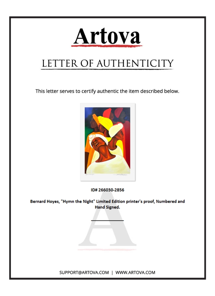 "Hymn the Night" is a limited edition printer's proof serigraph on paper by Bernard Hoyes, numbered and hand signed by the artist. Includes Letter of Authenticity. Measures approx. 33" x 25" (border), 28" x 18.5" (image).