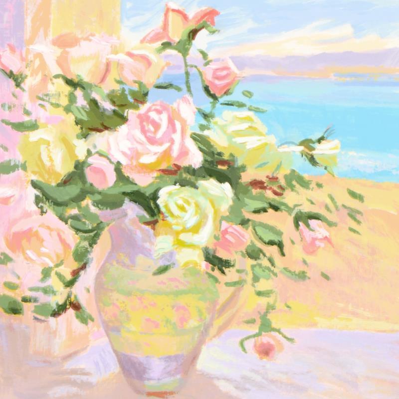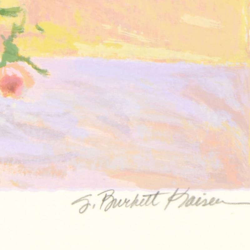 "Seaside Roses" is a limited edition giclee on paper by S. Burkett Kaiser, numbered and hand-signed by the artist. Includes Letter of Authenticity. Measures approx. 15" x 15" (border), 12" x 12" (image).