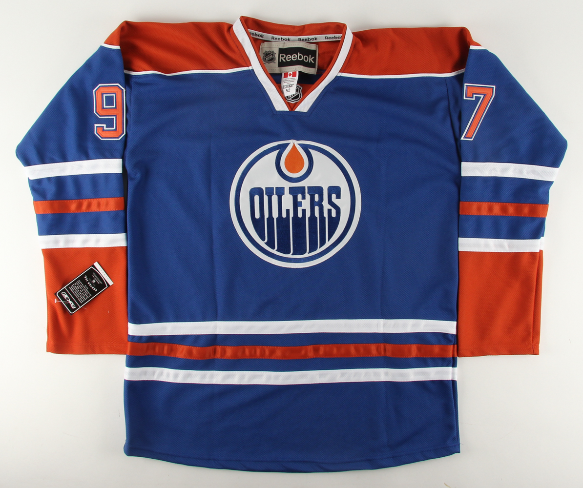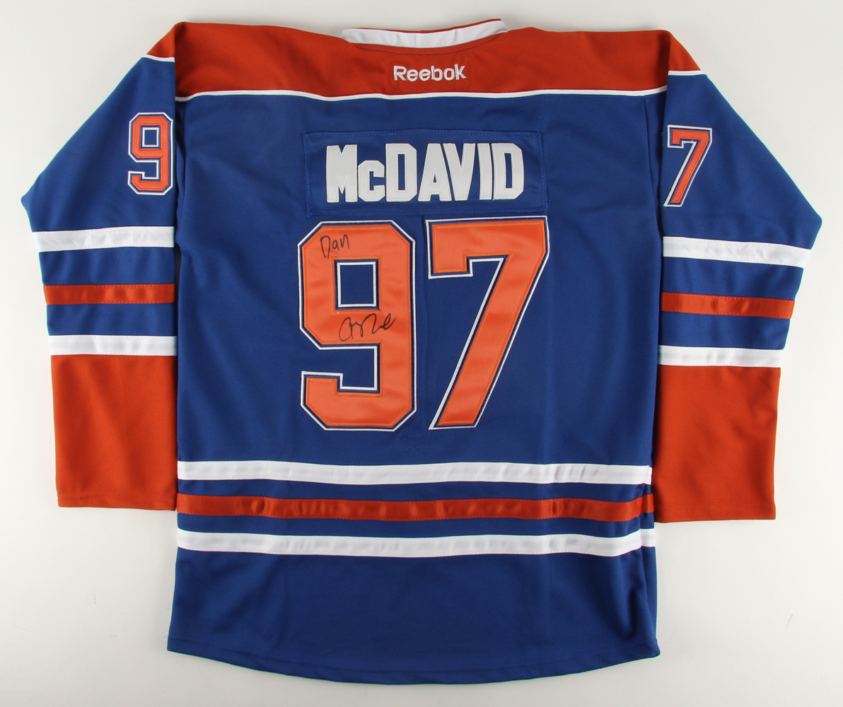 Reebok CCM on-ice style jersey. Everything is sewn on, size 52. Hand-signed in black felt-tip pen by Connor McDavid.