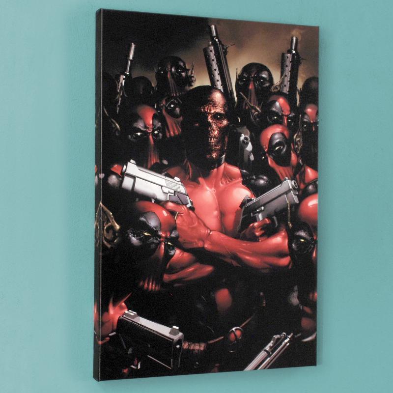 A piece of comic book history, this limited edition, from original art by Clayton Crain, depicts a multitude of Deadpools. Clayton Crain is an American comic book artist, who primarily uses digital painting techniques in his art. He is best known for his works on Ghost Rider: Road to Damnation, Venom vs. Carnage and Sensational Spider-Man (vol. 2). Crain's current work is X-Force for which he does both the covers and interior art. "Deadpool #2" is a limited edition giclee on canvas by Clayton Crain presented by Marvel Comics! This piece comes gallery wrapped. Includes Certificate of Authenticity! Measures approx. 18" x 27" (image).