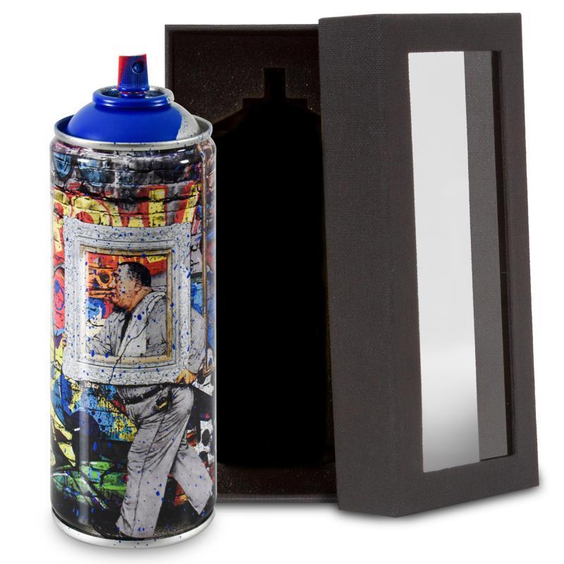 "Wall Frame (Blue)" is a numbered limited edition hand painted spray can by Mr Brainwash. This piece bears the plate signature of the artist and comes from his 2020 Classic Spray Can Collection. Measures approximately 2.5" x 7.5".