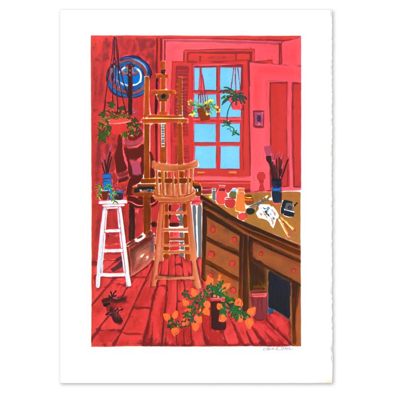 "Artist Studio" is a limited edition lithograph on paper by Edward Sokol, numbered and hand signed by the artist. Includes Letter of Authenticity. Measures approx. 20" x 27.5" (with border), 16" x 24" (image). Please note: there are minor imperfections in the white border area that may be concealed when the piece is framed.