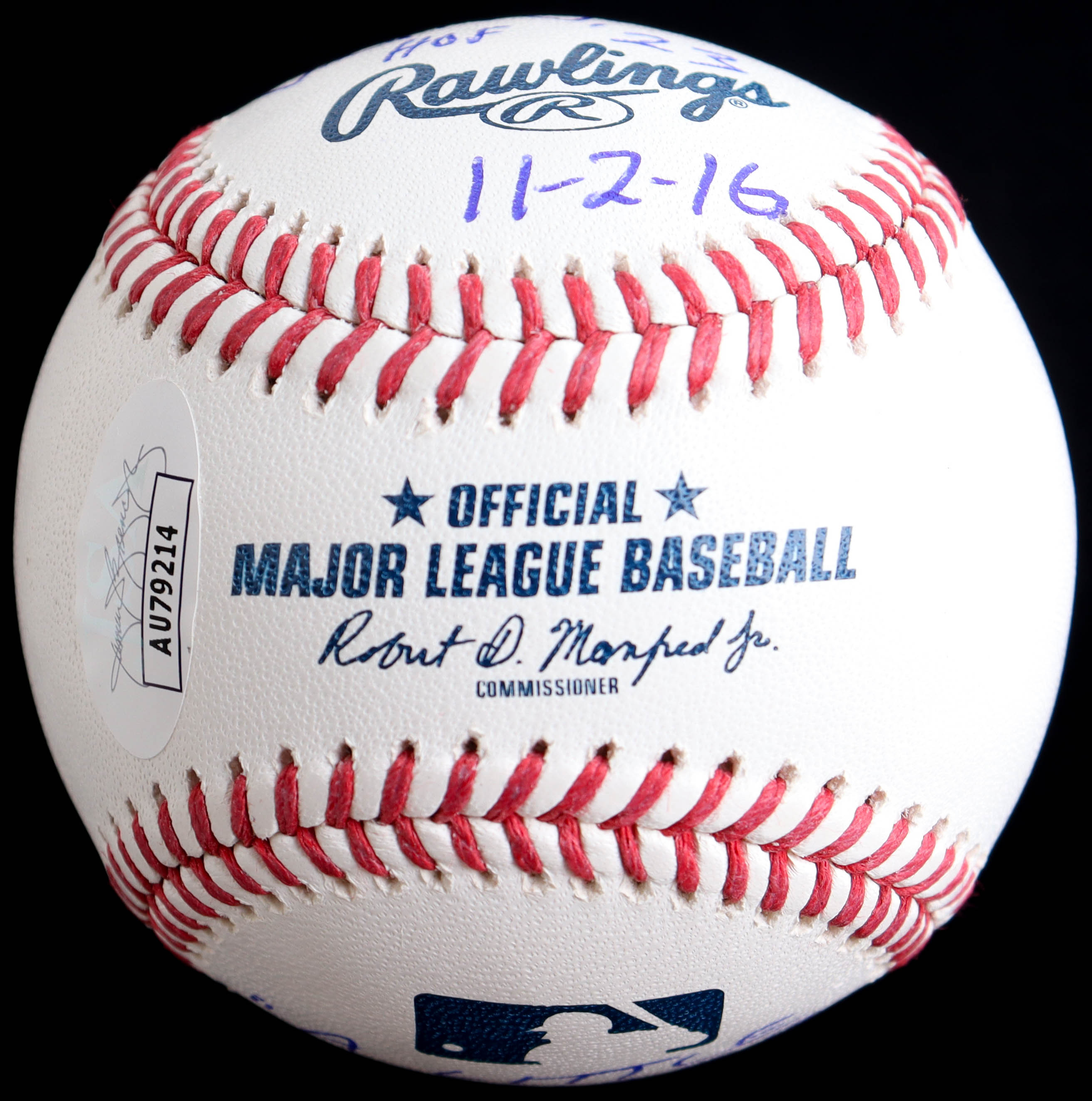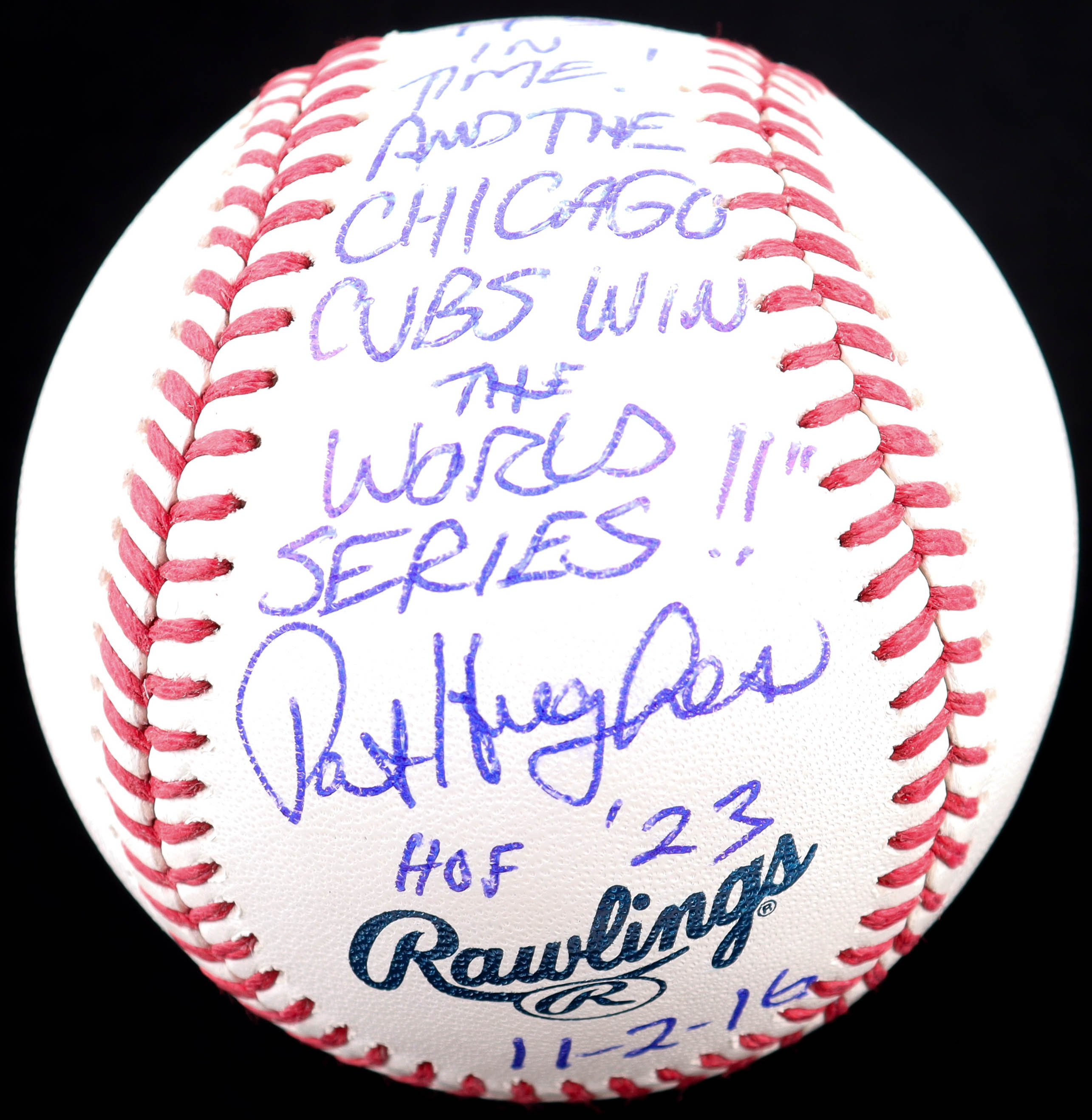 Rawlings Official Major League baseball. Hand-signed and inscribed by Pat Hughes (HOF).