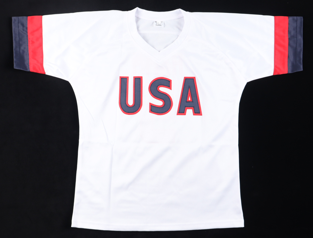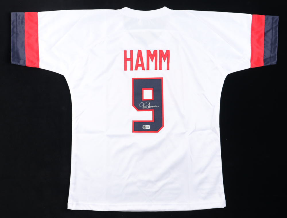 Custom jersey with everything sewn on, size L. Hand-signed by Mia Hamm.