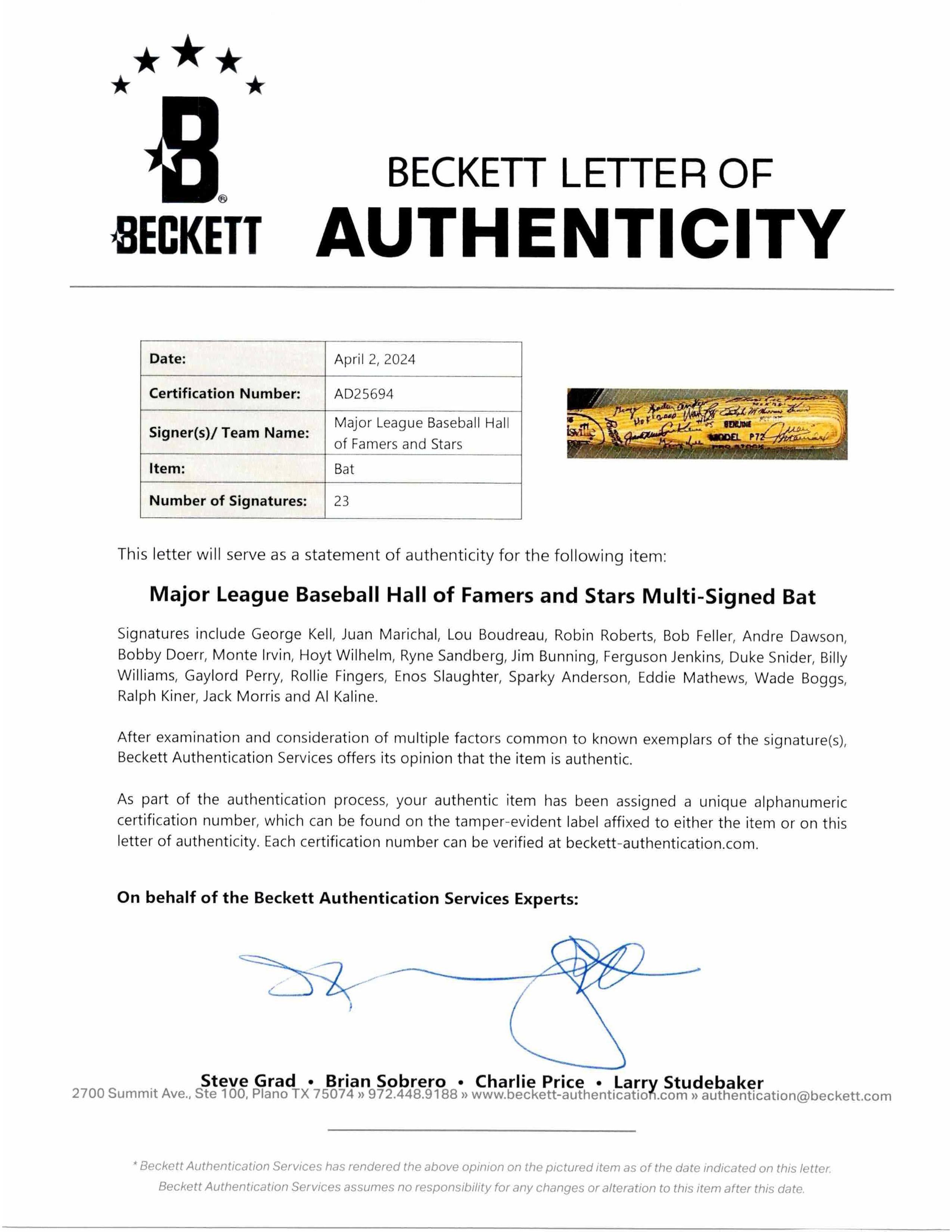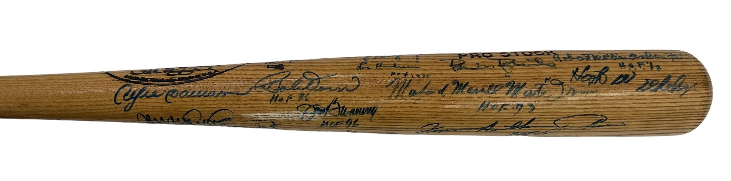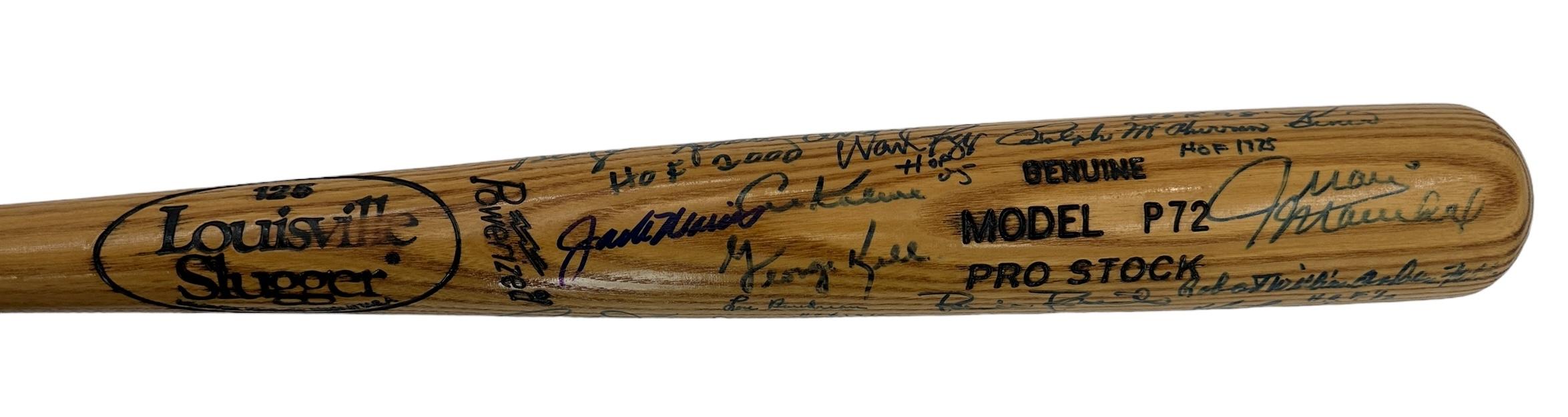 Louisville Slugger baseball bat has been hand-signed by (23) baseball Hall of Famers and stars. Signers include:
