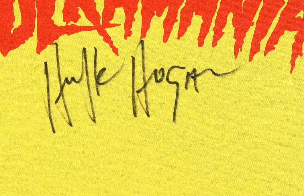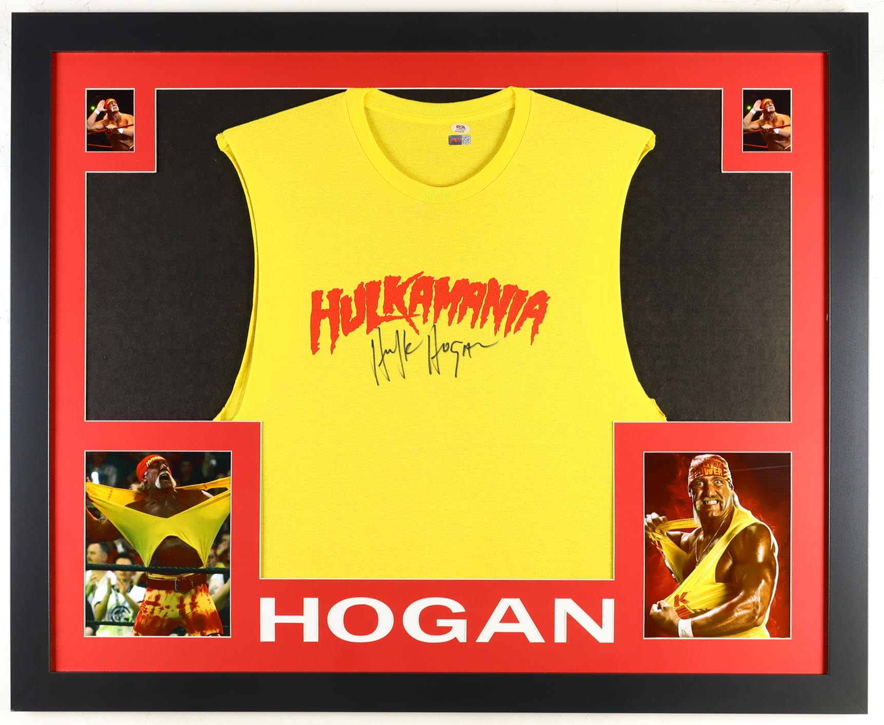 Custom framed display measures approximately 34" x 42" in size and features a "Hulkamania" T-Shirt that has been hand-signed by Hulk Hogan (HOF).