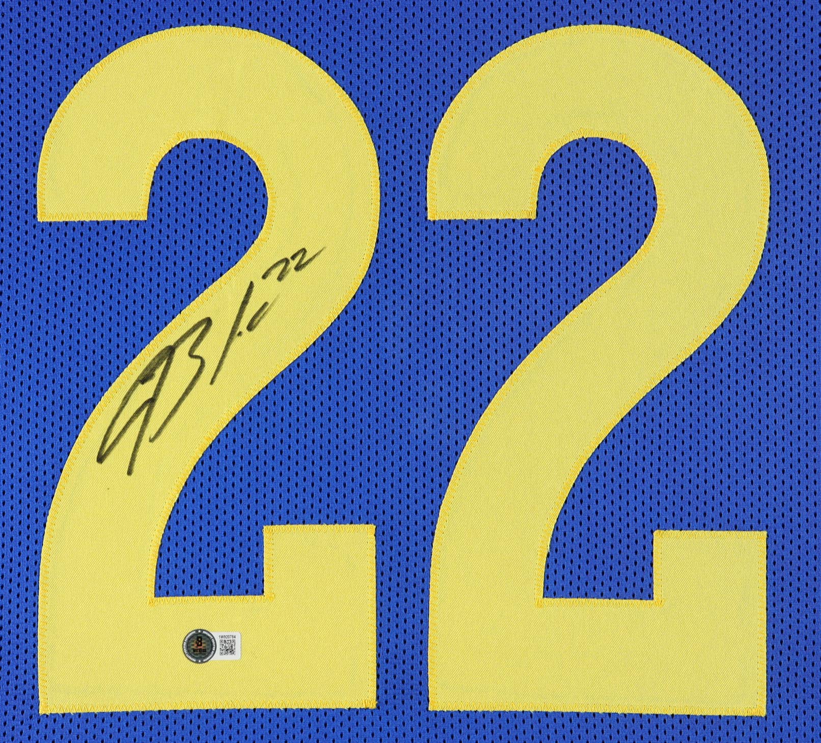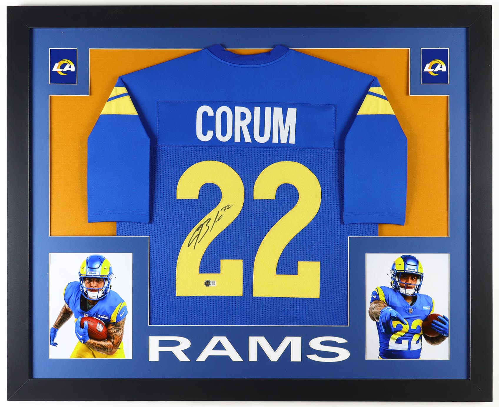 Custom frame measures approximately 35" x 44" in size. Features a jersey that has been hand-signed by Blake Corum. Please note that the 8" x 10" photos may be in reverse order.