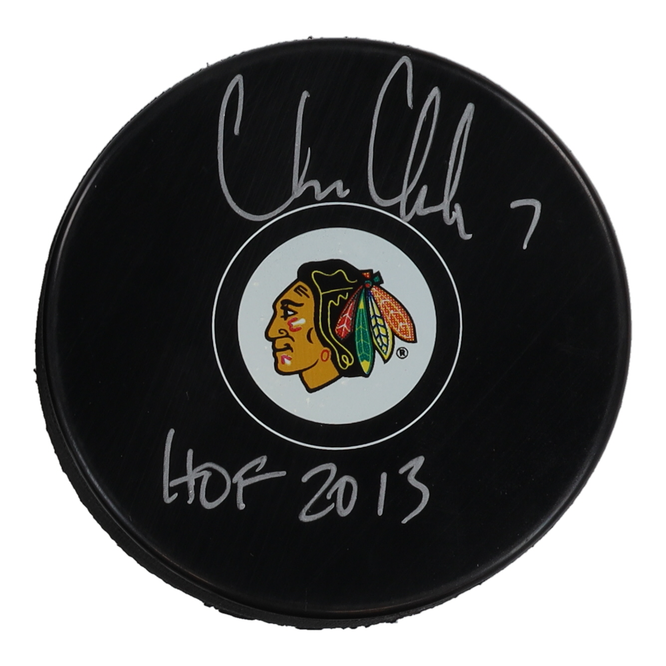 Chicago Blackhawks logo hockey puck has been hand-signed and inscribed by Chris Chelios (HOF).