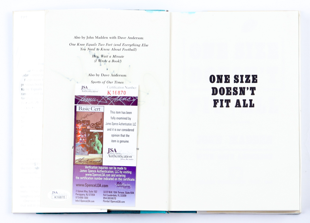 "One Size Doesn't Fit All" hardcover book has been hand-signed and inscribed on the inside cover page by John Madden (D. 2021, Philadelphia Eagles, HOF). Please note, there is scuffing, staining and edge wear on the book.