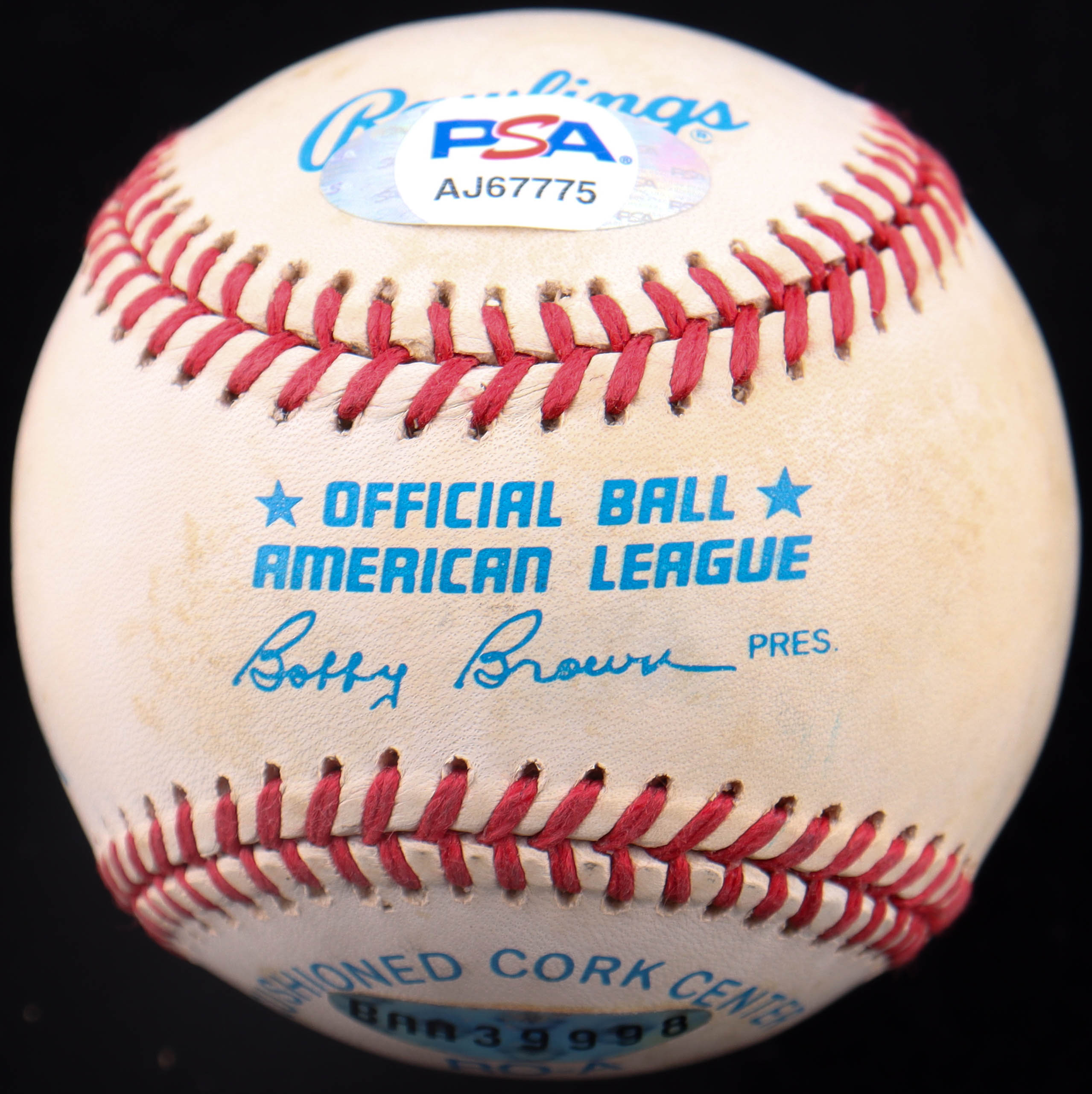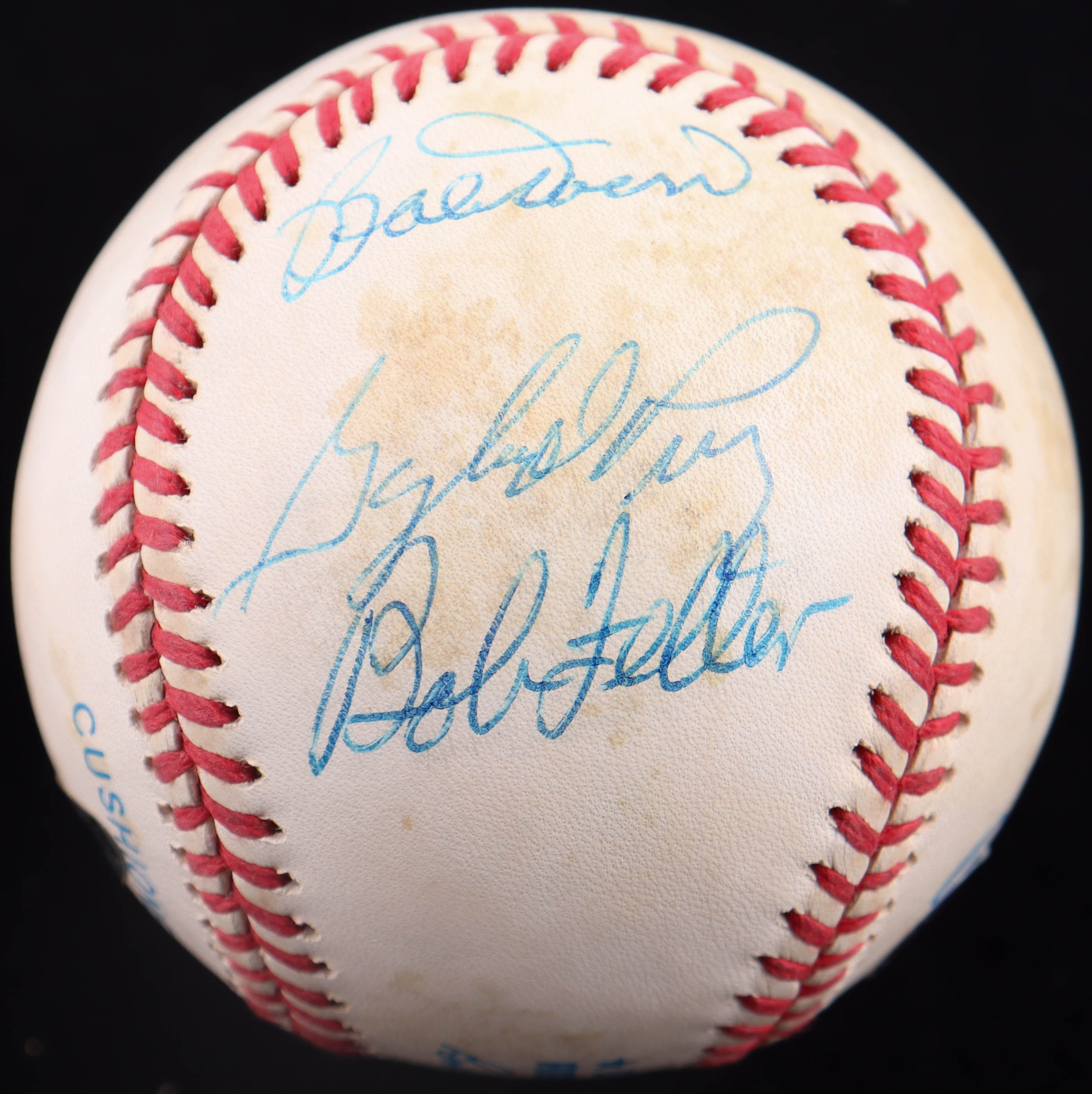 Rawlings Official American League baseball. Hand-signed by Bobby Doerr (D. 2017, Boston Red Sox, HOF), Bob Feller (D. 2010, Cleveland Indians, HOF) and Gaylord Perry (D. 2022, San Francisco Giants, HOF).