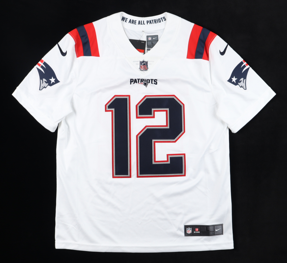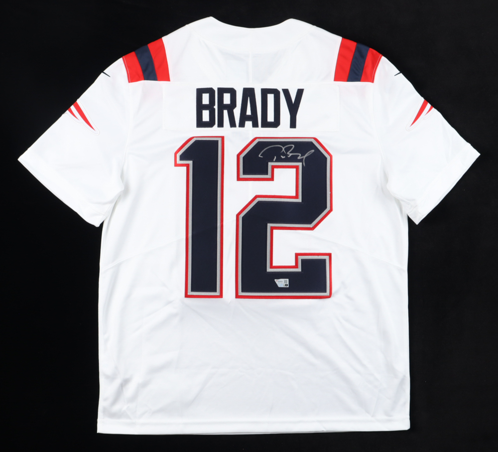 Nike jersey. Everything sewn on, size L. Hand-signed by Tom Brady (New England Patriots). Please note, there is red staining on the shoulders.