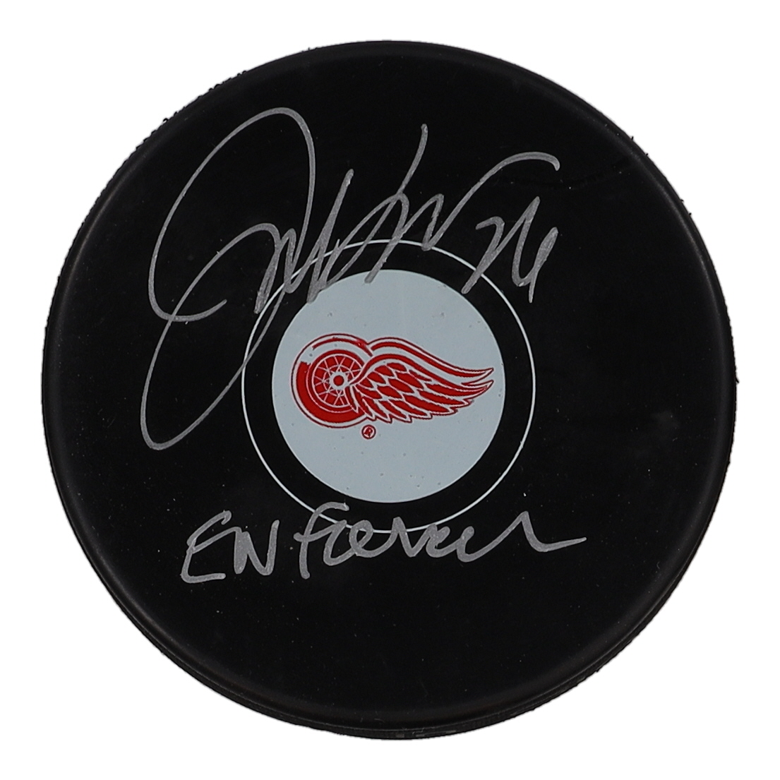 Detroit Red Wings logo hockey puck has been hand-signed and inscribed by Joe Kocur.