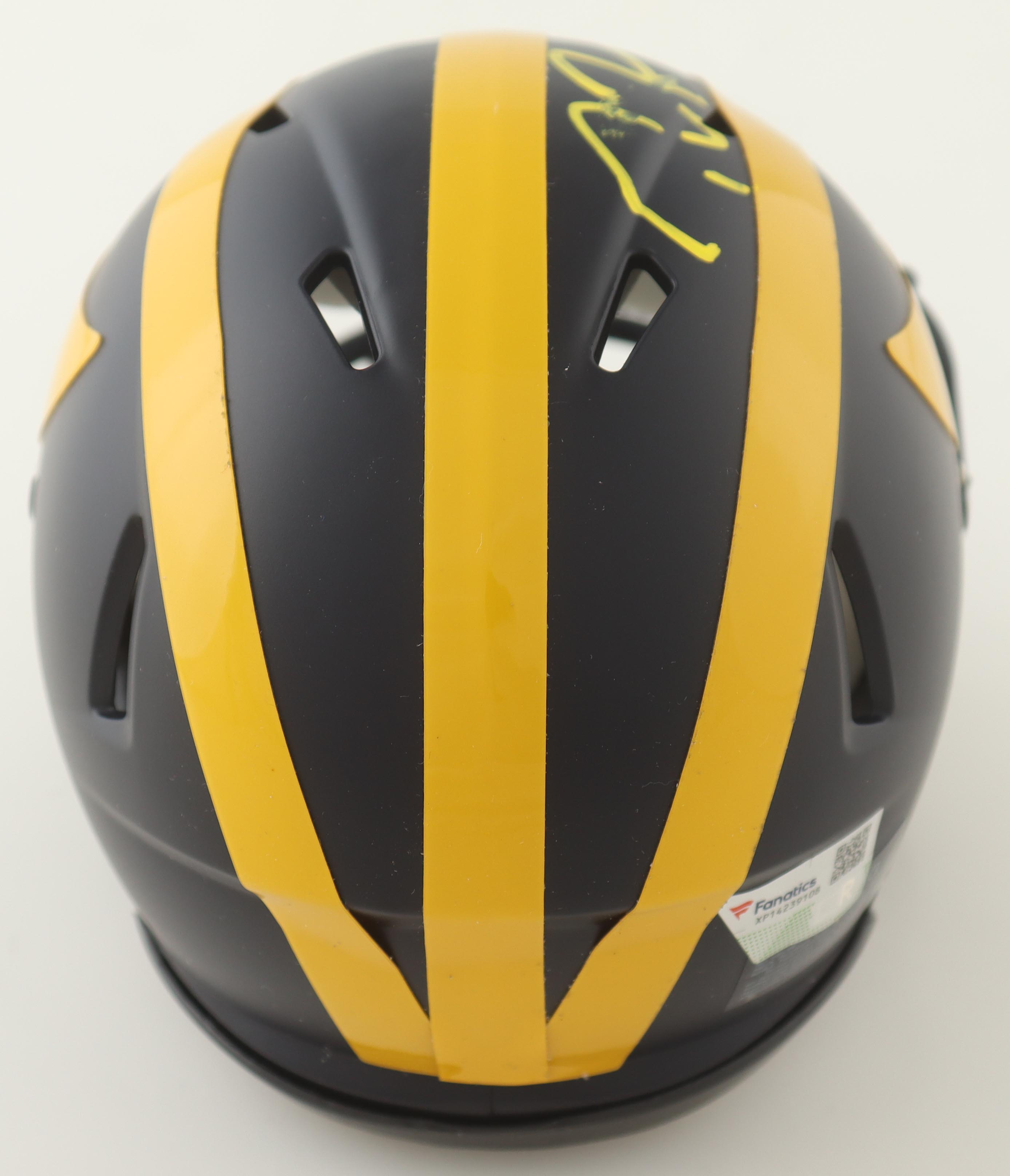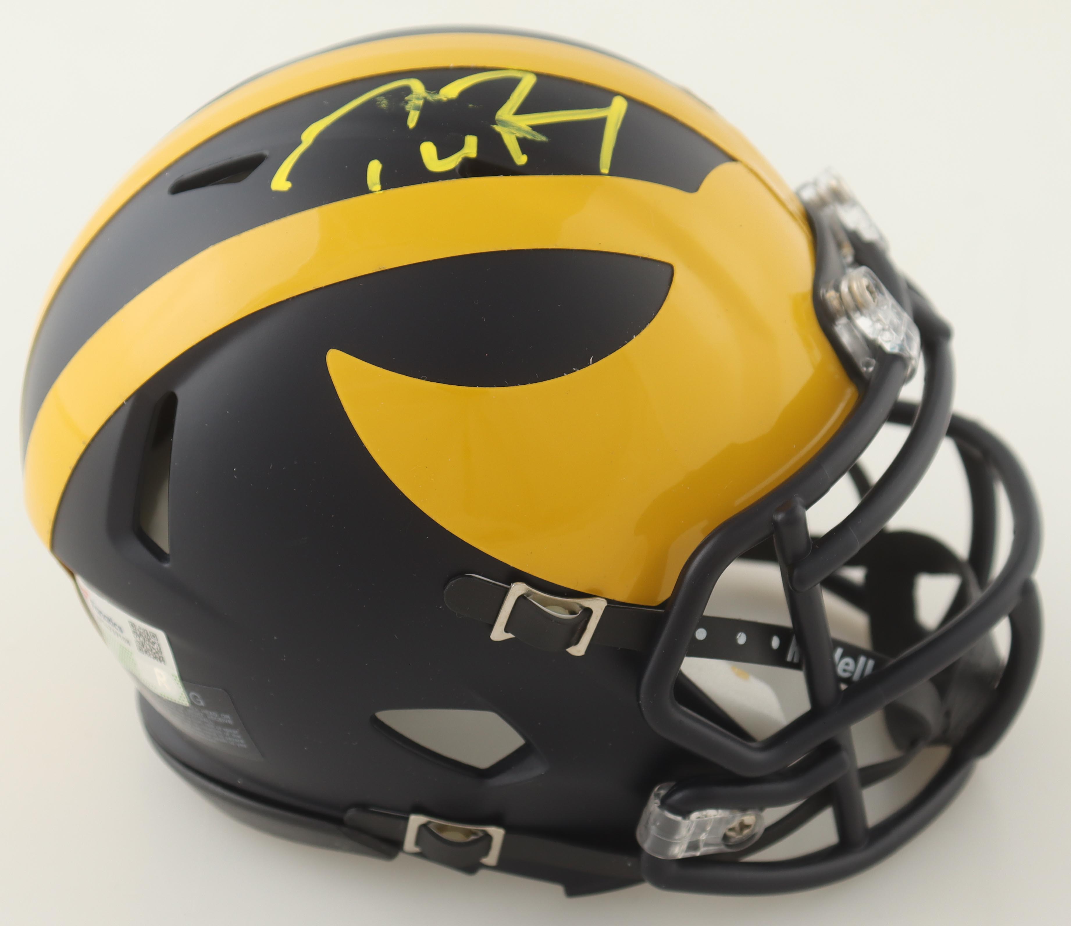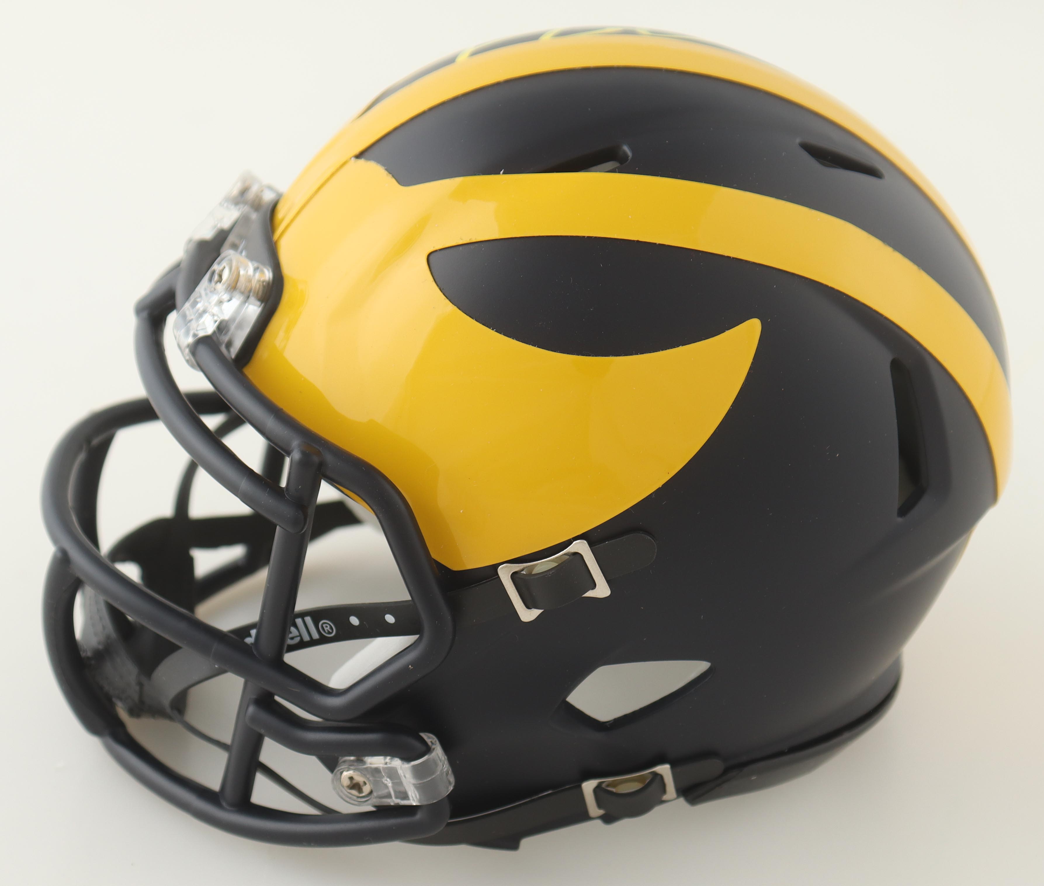 Riddell Michigan Wolverines Speed mini helmet has been hand-signed by Tom Brady. Please note signature is smudged.