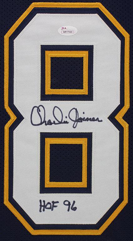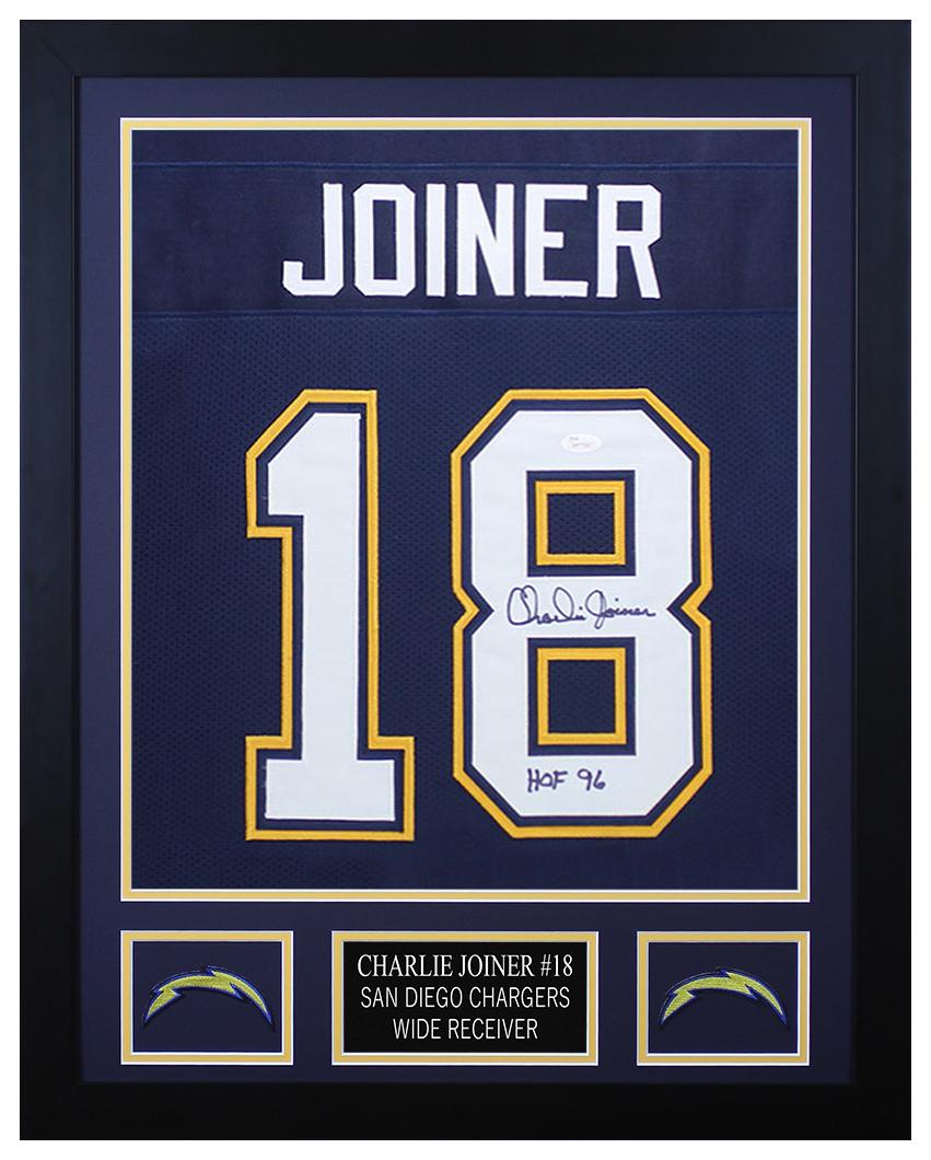 Custom frame measures 24" x 30" in size and features a jersey that has been hand signed and inscribed by Charlie Joiner (HOF).