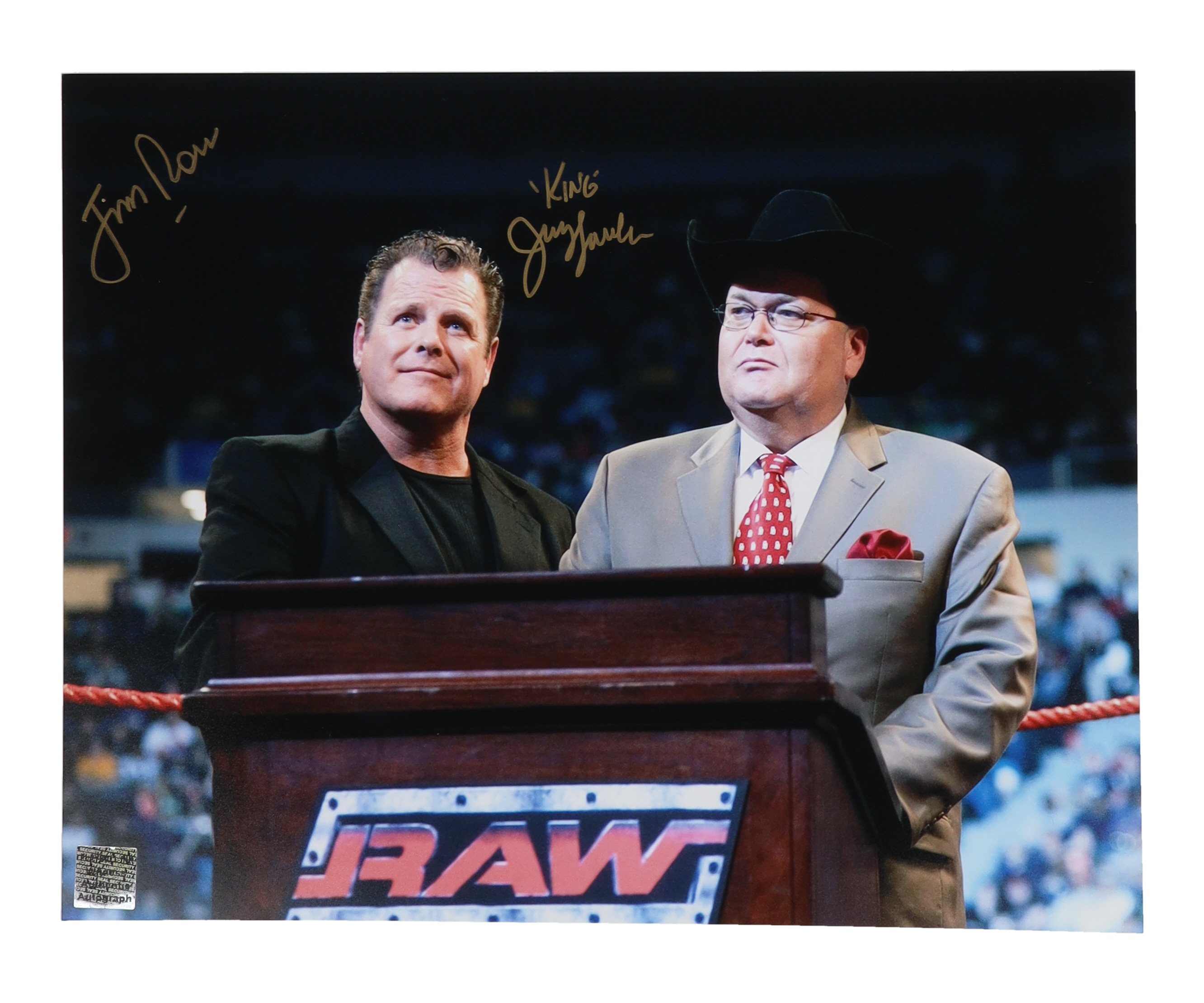 Photo measures 11" x 14" in size and has been hand-signed by Jerry Lawler (HOF) and Jim Ross (HOF).