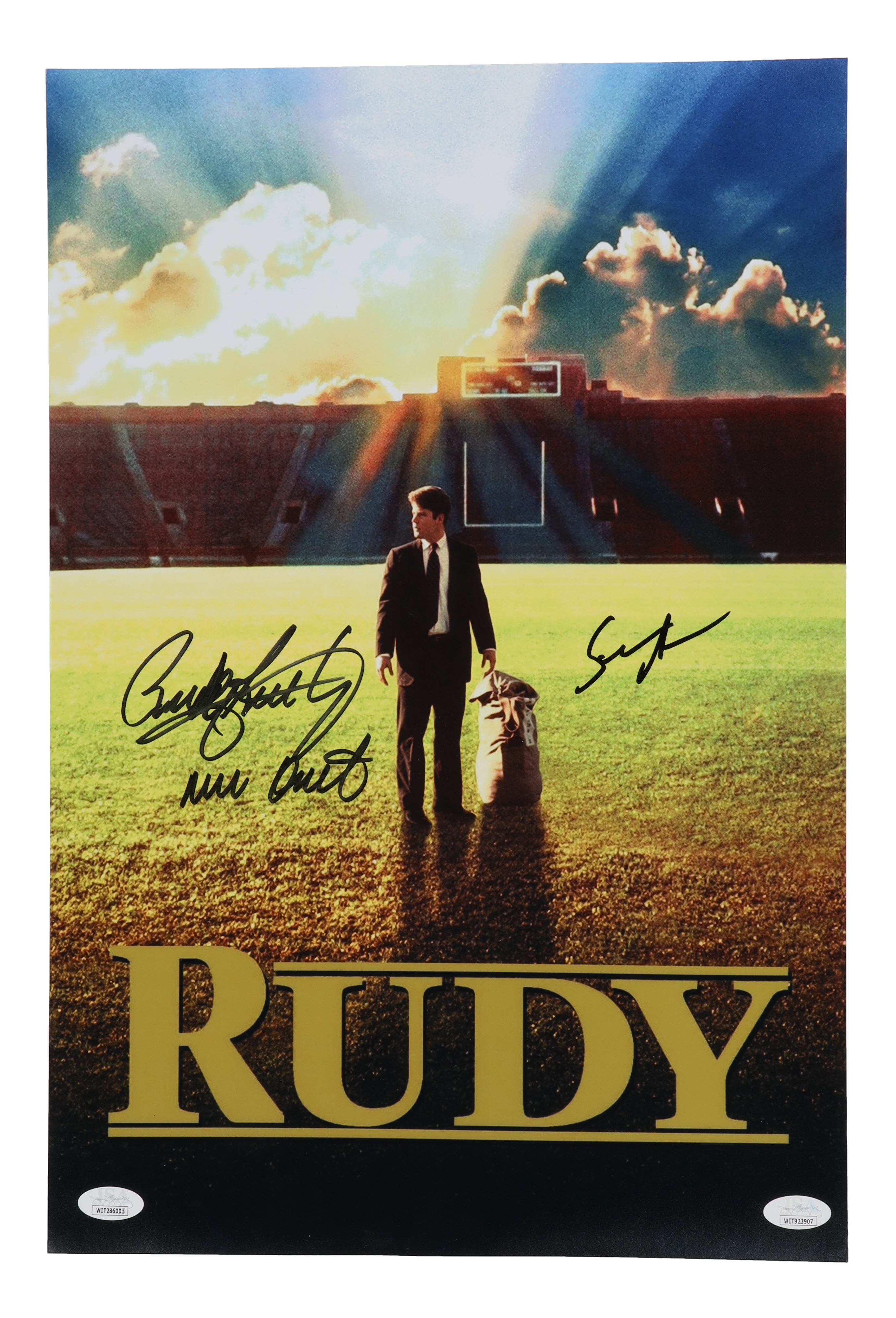 Photo measures approximately 12" x 18" in size and has been hand-signed and inscribed by Rudy Ruettiger (Notre Dame Fighting Irish) and Sean Astin (Rudy). Please note, the bottom of the photo is creased.