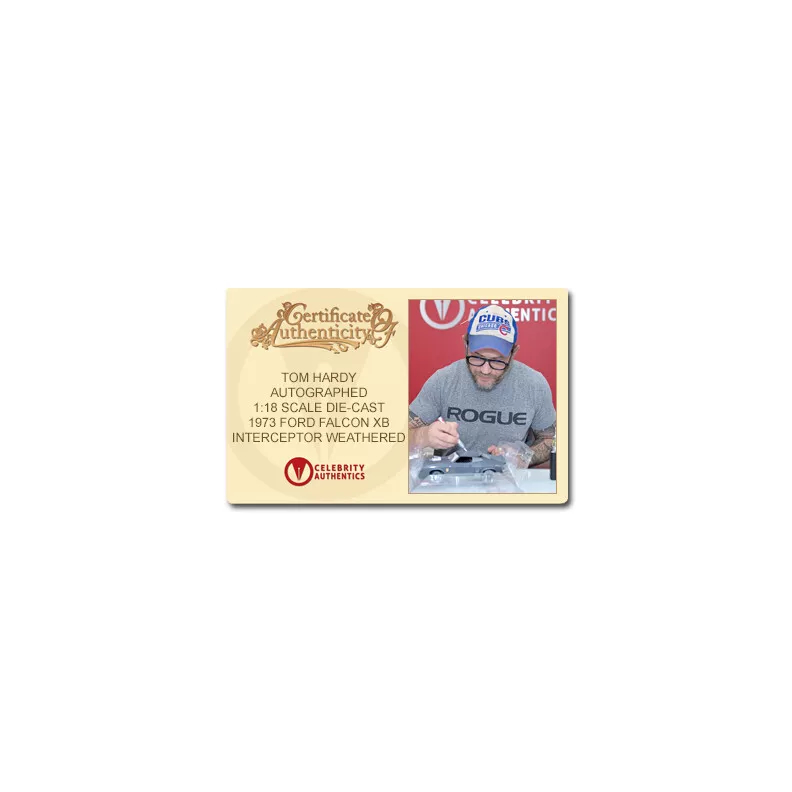 This Mad Max 1:18 Scale Diecast Last of the V8 Interceptors 1973 Ford Falcon XB (Weathered Version) has been personally autographed by Tom Hardy during his signing with Celebrity Authentics.